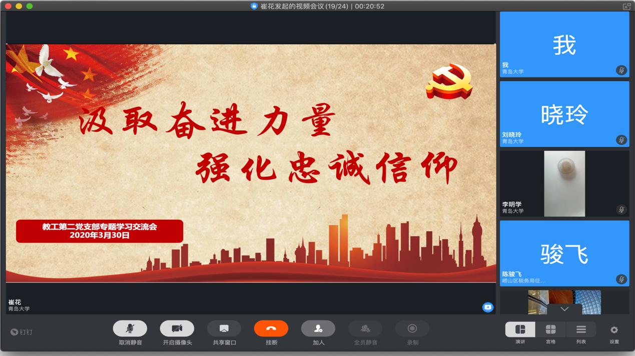 3月20日下午,今年会jinnianhuicom教工第二党支部利用钉钉视频会议召开了“汲取奋进力量,强化忠诚信仰”专题视频学习交流会。会议由教工第二党支部书记崔花主持,今年会jinnianhuicom党委书记王传永及二支部教师党员参加会议。与会党员认真开展了政治理论学习,并结合疫情期间网上授课的经验和体会,对“开展网络思政、强化爱国主义教育、强化对党、对国家的忠诚信仰”等方面内容进行了交流讨论。