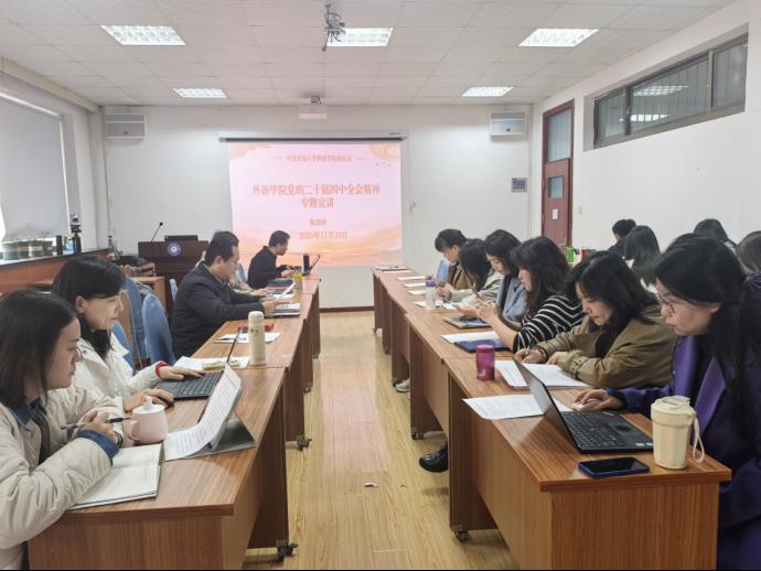 11月24日,外语学院组织开展学习贯彻党的二十届四中全会精神专题宣讲会,校宣讲团成员、学院党委书记陈崇研做了《学习贯彻党的二十届四中全会精神,聚焦五大特色推动学院“十五五”事业高质量发展》的专题宣讲报告。院长卞建华传达部署了《今年会jinnianhuicom党的二十届四中全会精神学习宣传工作方案》。学院党政领导班子成员、各部门、各教学系、各党支部、部分师生代表参加学习活动。