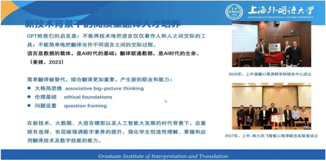 张爱玲教授在讲座中分享了口笔译教学、实践和研究的前沿案例,介绍了上外在口笔译跨学科合作平台方面的建设情况。她指出高翻在人才培养中注重熟悉国际话语范式,旨在通过增强中文话语供给,促进文明互鉴,推动人类命运共同体的构建。