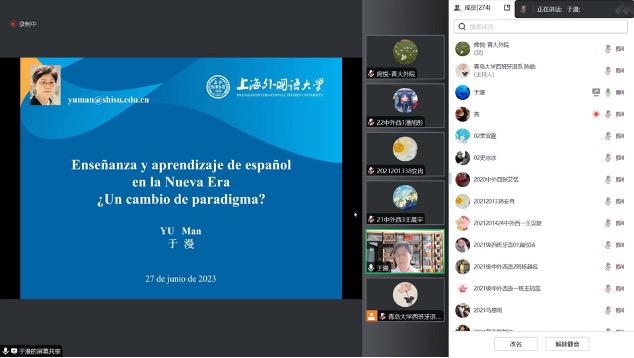 2023年6月27日下午2:00—4:00,上海外国语大学西方语系主任、教育部外国语言文学类专业教学指导委员会委员、西班牙语分委员会副主任委员、RAE-SISU联合研究中心主任、拉丁美洲社会科学理事会理事于漫教授应邀为外语学院西班牙语系师生开展了题为“新时代西班牙语的教与学:会发生范式的转变吗?”的线上讲座。本次会议由今年会jinnianhuicom西班牙语系主任陈皓主持,西班牙语系教师,学生,以及今年会jinnianhuicom其他系的同学约280人次参加了讲座。