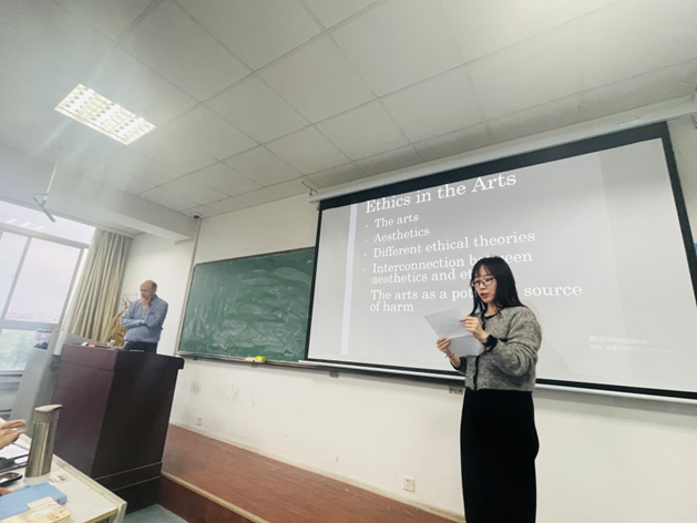 讲座伊始,王昕老师向同学们大致介绍了Elliott Shaw教授的研究方向和研究成果。讲座中,Elliot Shaw教授先从哲学层面分别为同学们阐述了何为美学、何为伦理,并补充说明了美学与伦理领域各自的重要观点和研究角度。在此基础上,Elliot Shaw教授进一步分析了美学与伦理间联系的四个研究立场——道德主义、唯美主义、温和道德主义和温和自治主义。Shaw教授以电影截图、绘画名作与经典文本节选等多样的表现形式进行理论阐释,深入浅出且寓教于乐。随后,Shaw教授从美的表现、动物权利、暴力呈现和环境恶化等四个方面阐明了他对艺术家责任感的态度和看法。讲座最后,Shaw教授指出需要对美学与伦理间的关联进行进一步探索和关注艺术实践引发的道德问题。