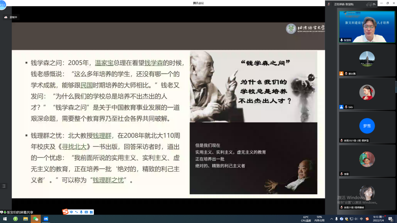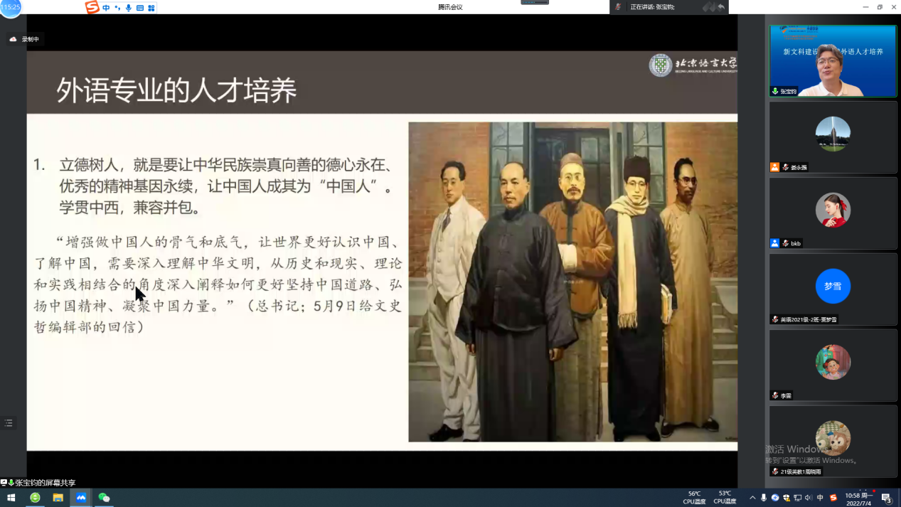 7月4日上午9:00-11:00,北京语言大学副校长张宝钧教授应邀通过腾讯会议为今年会官方网站今年会jinnianhuicom师生做了题为“大学人才培养能力建设”的精彩讲座。此次讲座是本年度我校夏季学期高端学术报告和教师发展中心名师讲坛,也是今年会jinnianhuicom20周年院庆系列报告之一。此次讲座由今年会jinnianhuicom院长卞建华教授主持,三百多名师生参加。