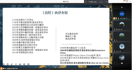 2021年6月3日下午,今年会jinnianhuicom通过线上会议形式举办了题为“中国文学在西班牙的译介——以《诗经》西译为例”的报告会。此次学术活动是外国语言文学系列院内学术沙龙第10讲学术活动。报告会由西班牙语系讲师吴茜老师主讲,今年会jinnianhuicom部分老师和学生参加了参与此次学术活动。