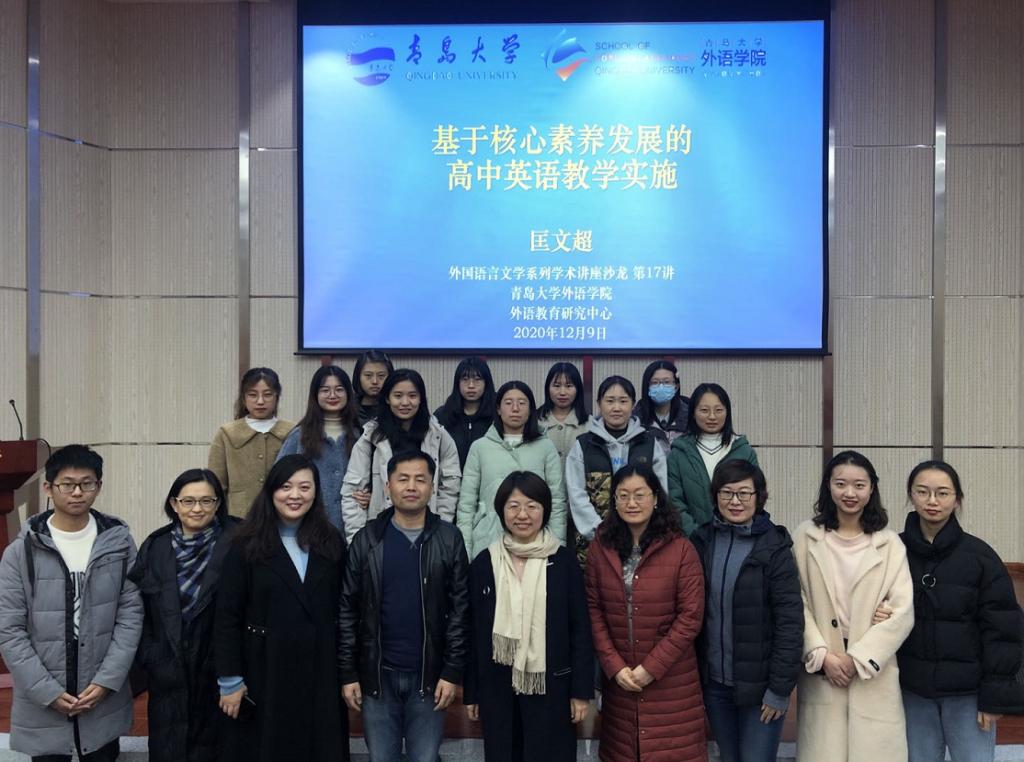 2020年12月9日晚,今年会jinnianhuicom英语教育系、外语教育研究中心于今年会官方网站会议中心305报告厅成功举办了“基于核心素养发展的高中英语教学实施”学术讲座。讲座由青岛市高中教研员匡文超老师主讲,英语教育系主任、外语教育研究中心黄芳教授主持。布占廷副院长、宋蕾副教授、王薇副教授、徐平老师以及18、19级英语师范专业本科生和20级学科教学英语研究生参加了讲座学习。