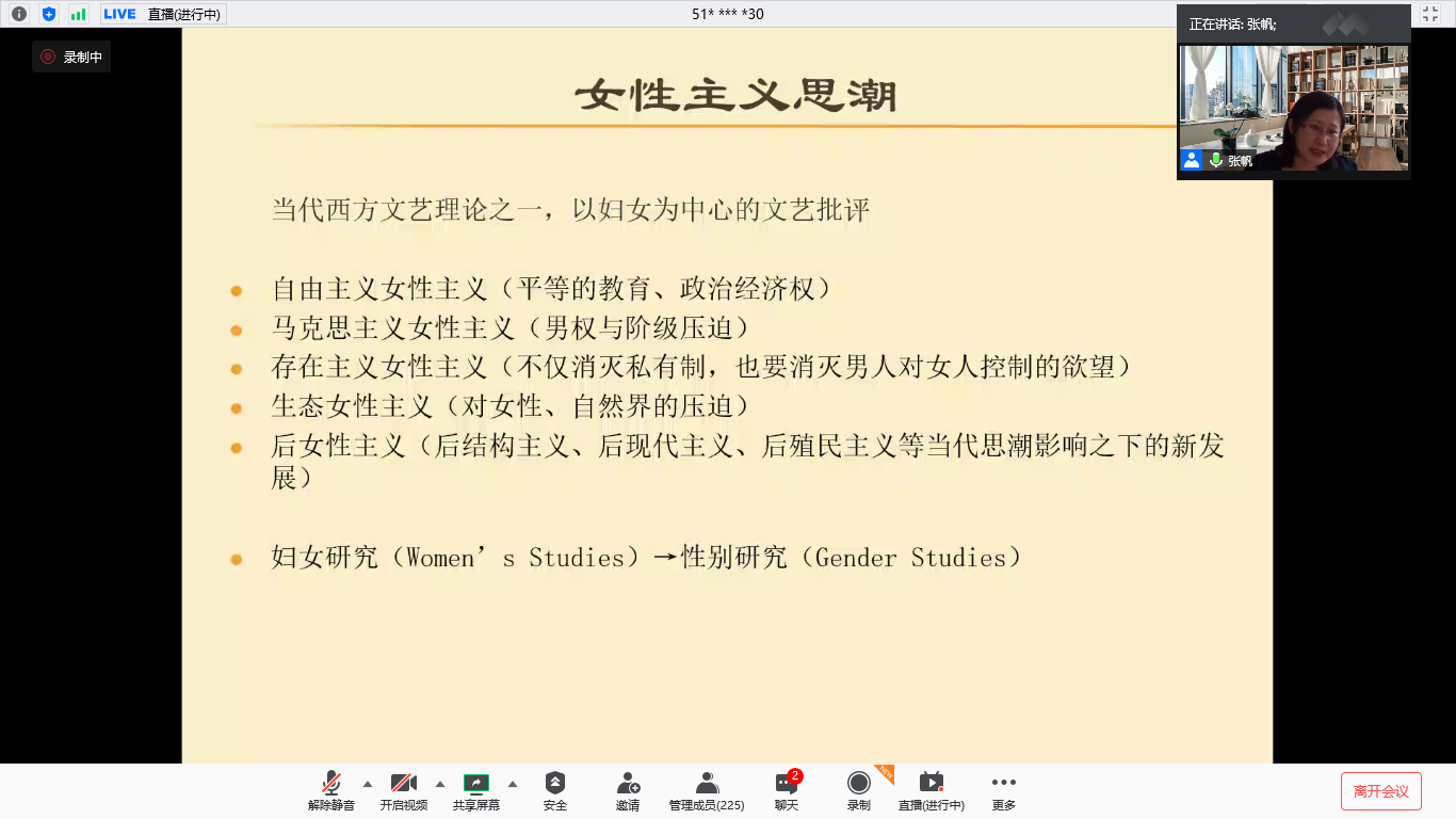 8月31日上午,受今年会官方网站今年会jinnianhuicom邀请,我校德语系94级校友、上海外国语大学博士生导师张帆教授通过腾讯会议为我们带来了“德语女性主义语言学导论”的学术讲座。本次讲座由德语系主任綦甲福教授主持,德语系师生、校友以及来自国内外高校的师生共230余名听众聆听了讲座。