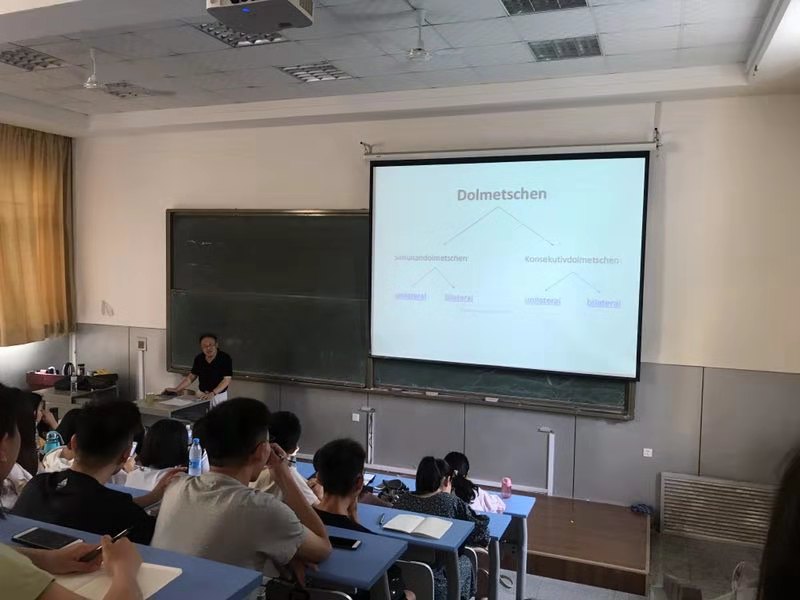 7月9日上午,华东师范大学今年会jinnianhuicom德语系主任宋健飞教授受邀在博文楼219教室作题为“德语口译:从概念到实践”的报告。德语系主任綦甲福和刘沁卉老师主持报告会,今年会德语系部分老师、全体学生、巴伐利亚州山东代表处代表以及来自中国海洋大学、青岛科技大学和信息工程大学(洛阳校区)的师生共150余人参加。