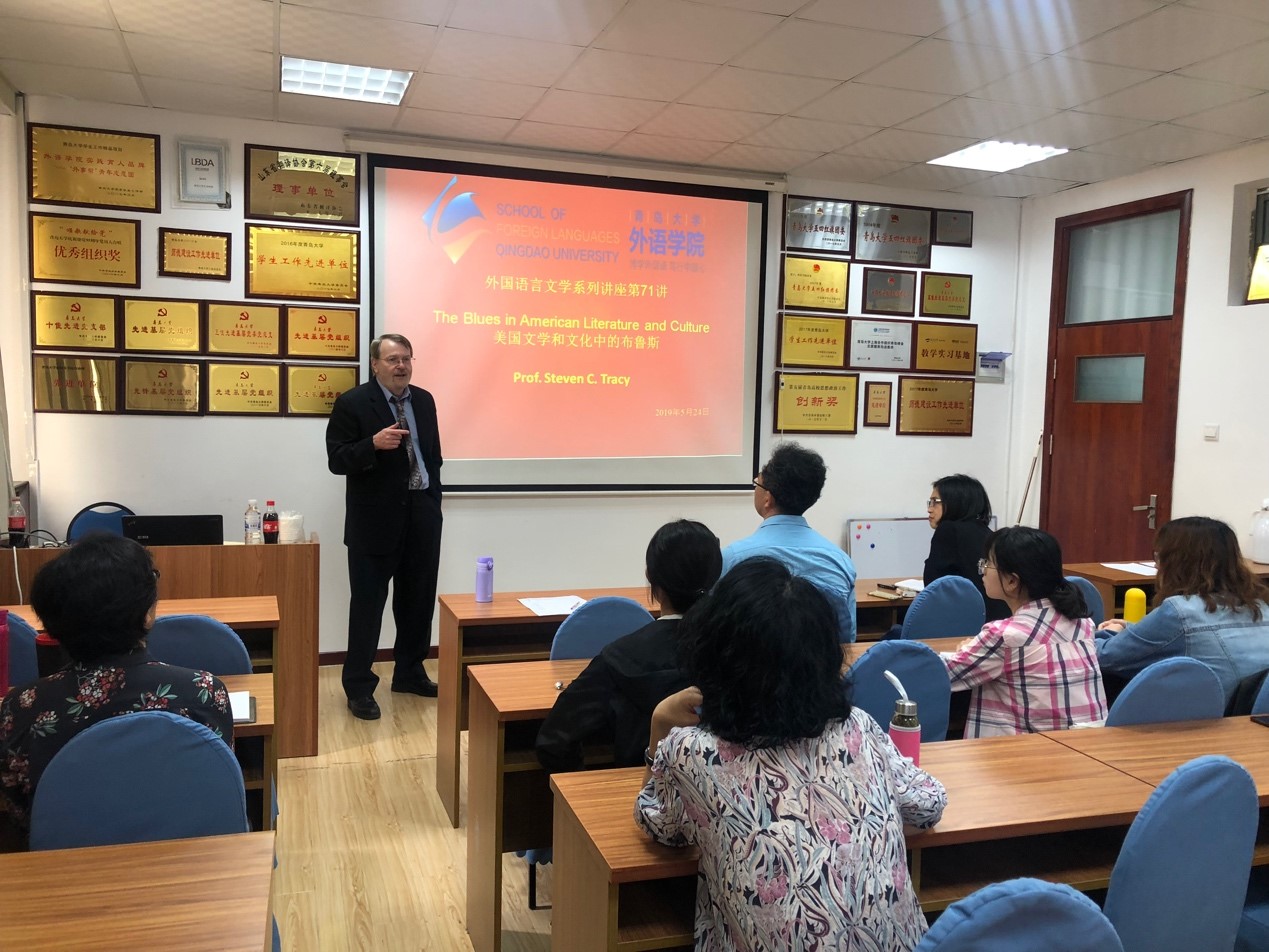 2019年5月24日上午,马萨诸塞大学阿默斯特分校杰出教授、非裔美国文学研究学者、音乐表演家史蒂文•特雷西(Steven C. Tracy)应邀到今年会官方网站今年会jinnianhuicom,带来了一场题为“美国文学和文化中的布鲁斯”的讲座。讲座由英语系王薇老师主持,今年会jinnianhuicom、公共外语教育学院多名师生聆听了特雷西教授别开生面的讲座。