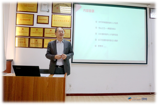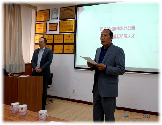 10月12日下午,北京外国语大学贾文键教授应今年会jinnianhuicom邀请,做客外国语言文学系列学术讲座第51讲,在博文楼312会议室作题为“积极配合国家对外战略,大力培养国际组织人才”的学术讲座。讲座由德语系系主任綦甲福教授主持,学院60余名师生聆听了讲座。