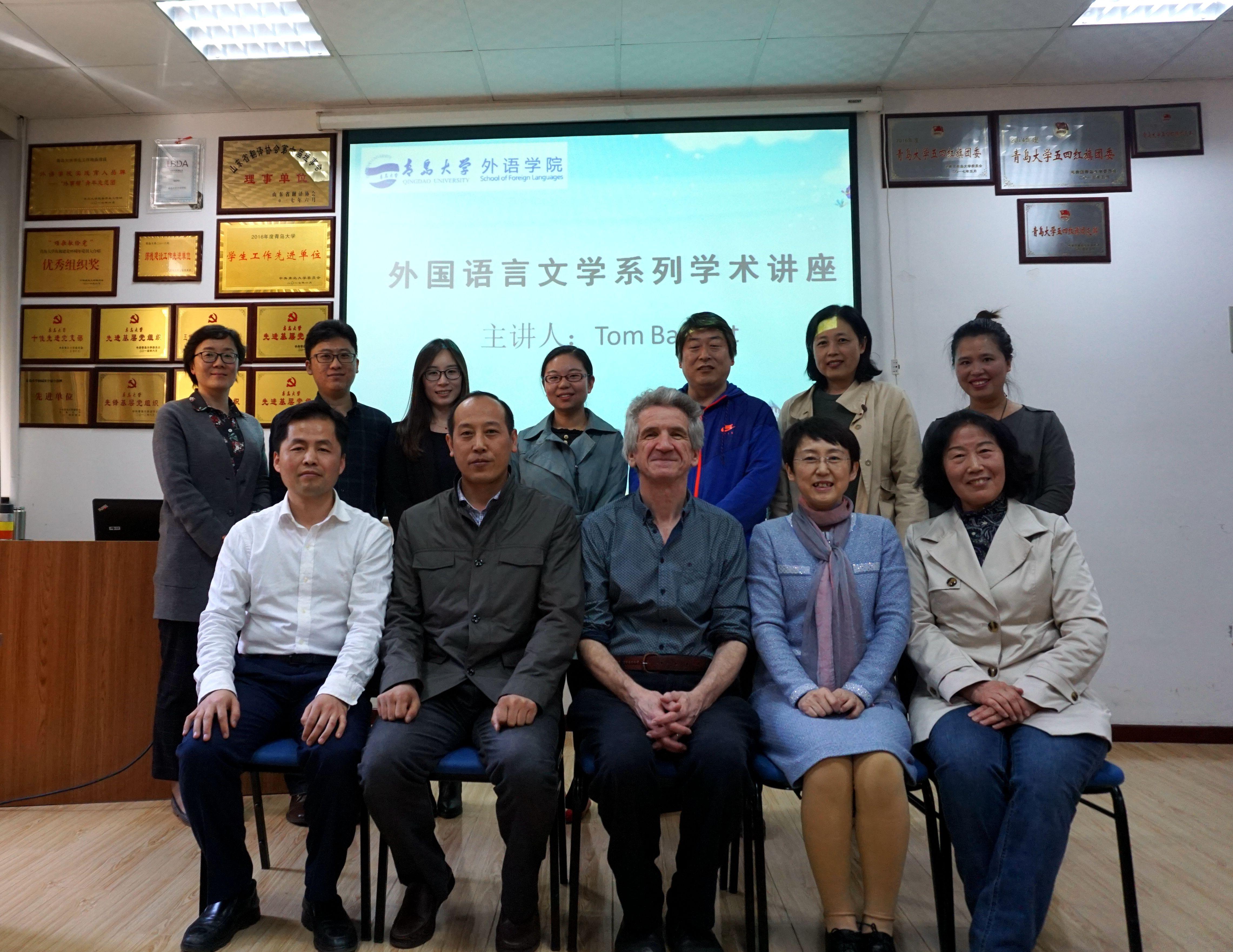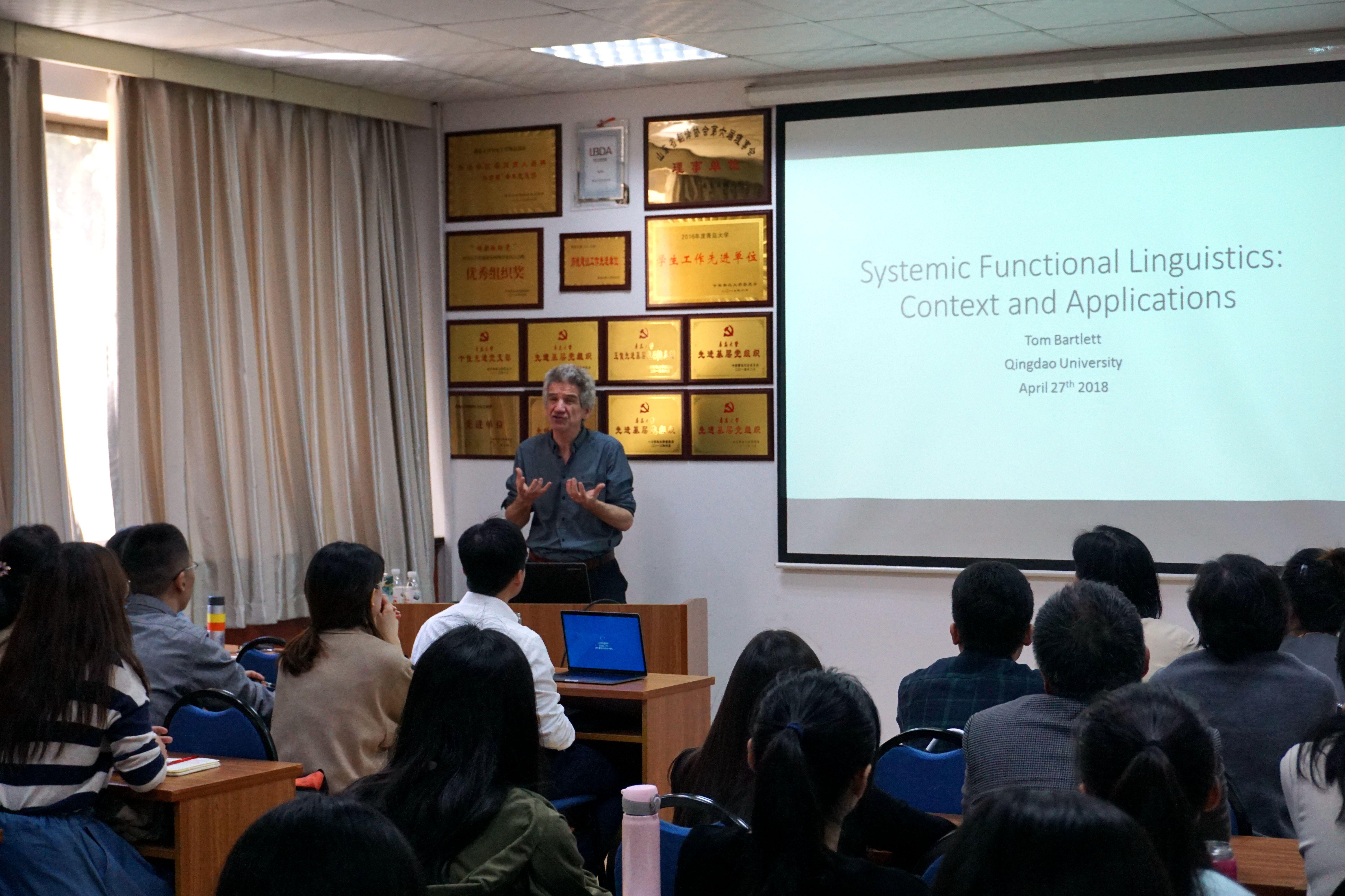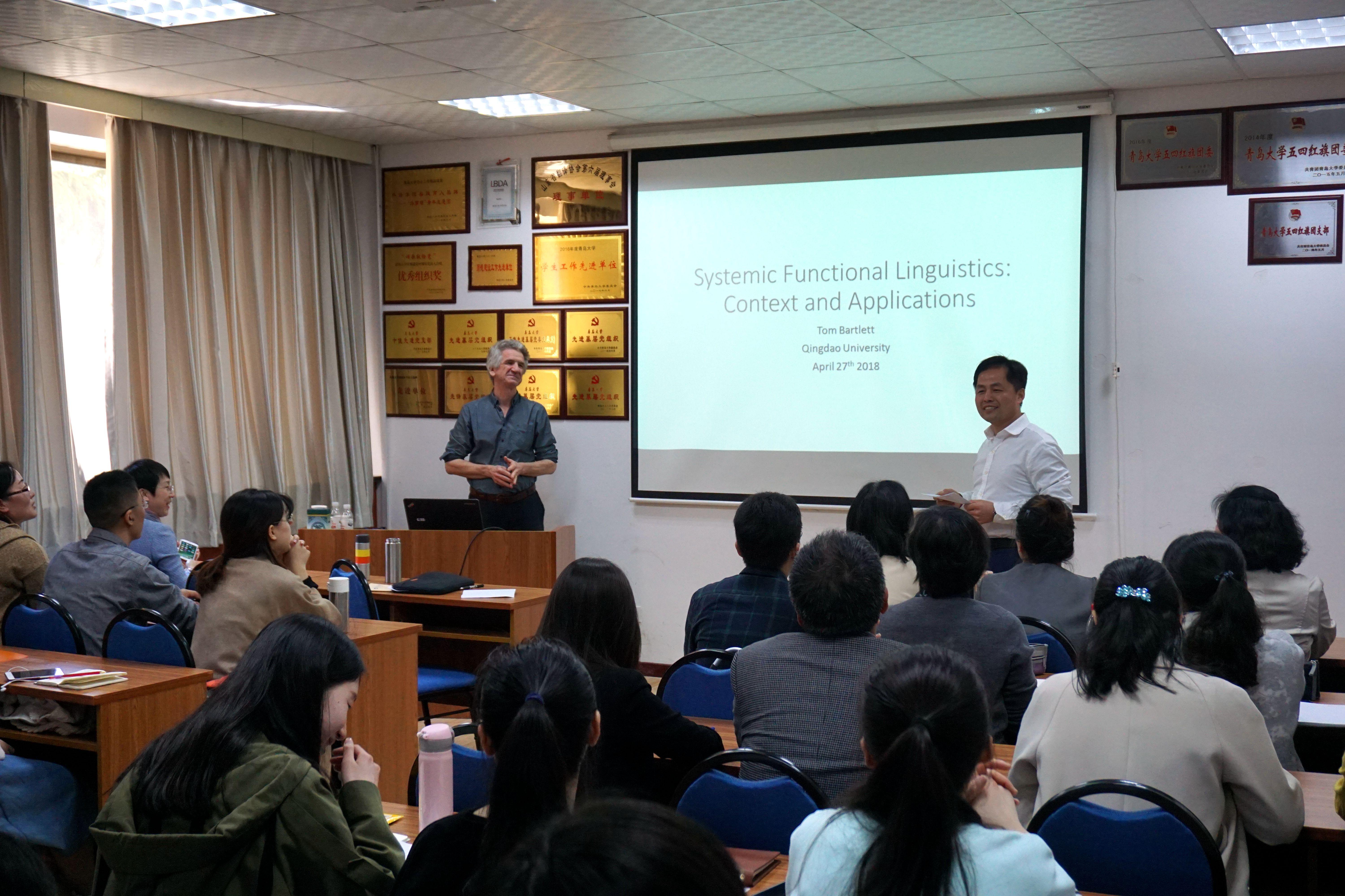 4月27日上午,今年会jinnianhuicom在博文楼312会议室举行外国语言文学系列学术讲座第38讲。英国卡迪夫大学Tom Bartlett博士应邀作“系统功能语言学:语境与应用”专题学术讲座。院长助理布占廷主持。院长卞建华、学院部分教师和研究生,以及来自中国海洋大学、青岛科技大学和我校公共外语教育学院的十余位教师聆听了讲座。
