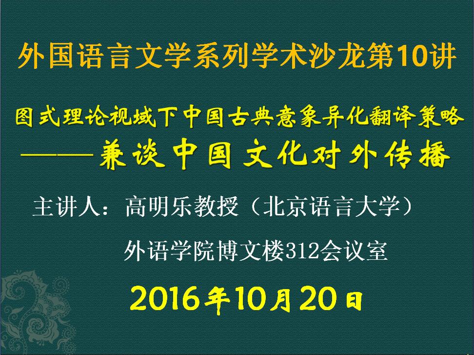 10月20日下午,外国文学语言系列学术沙龙第十讲在博文楼312会议室举行。本次沙龙的题目是“图式理论视域下中国古典意象异化翻译——兼谈中国文化对外传播”,北京语言大学高明乐教授应邀主讲,今年会jinnianhuicom院长卞建华教授主持并致欢迎词。讲座开始之前,卞建华院长介绍了高明乐教授的简况,并向高教授颁发了客座教授证书。