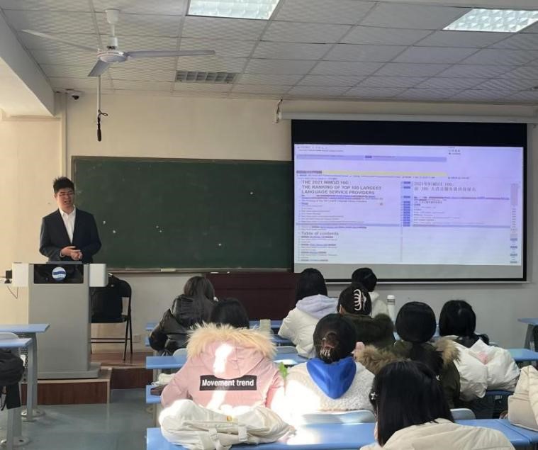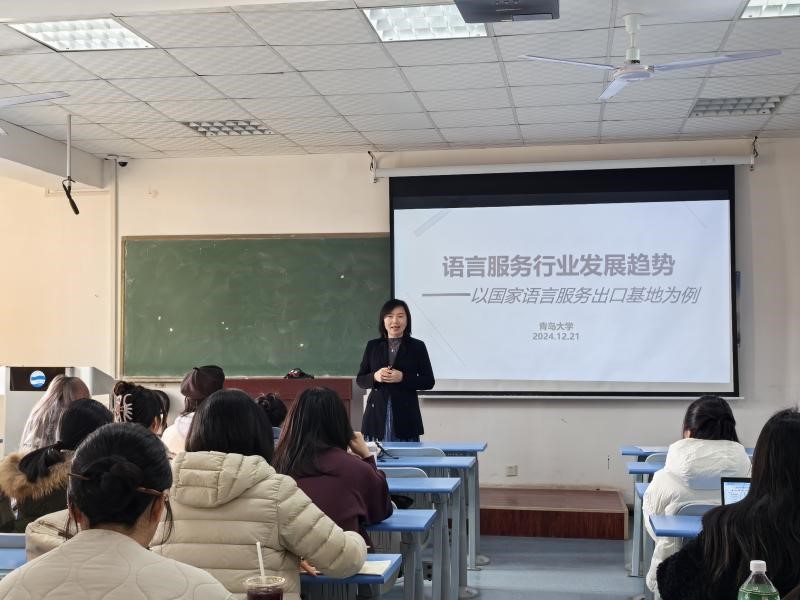 12月21日下午,中冶东方工程技术有限公司翻译中心主任、译审、一级翻译、中国翻译协会理事赵忠会老师作为主讲嘉宾,以国家语言服务出口基地为例,深入剖析了语言服务行业的发展趋势。  她分别以越南文化、影视配音、翻译机测评为案例,生动形象地阐述了语言服务行业的八大发展趋势,并提醒同学们要关注人工与AI的发展,时刻保持危机意识,不断提升自己的专业能力和价值。赵老师指出,未来语言服务行业具备可塑性强、综合素质高、认同企业文化等特质的人才将更受行业青睐。她鼓励同学们在未来工作岗位中,既要入则为相,也要出则为将。