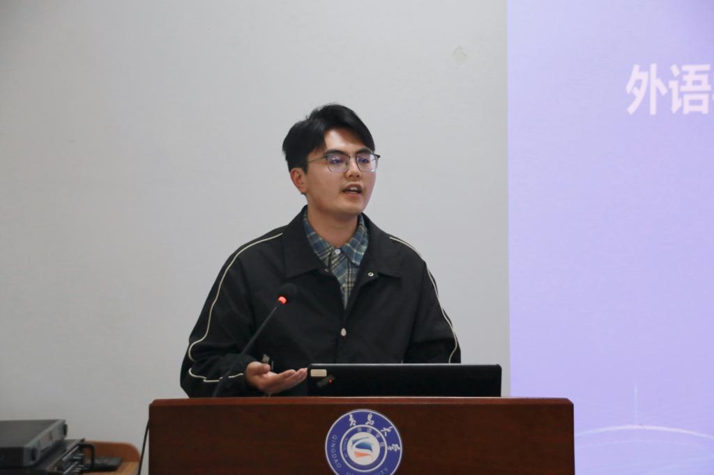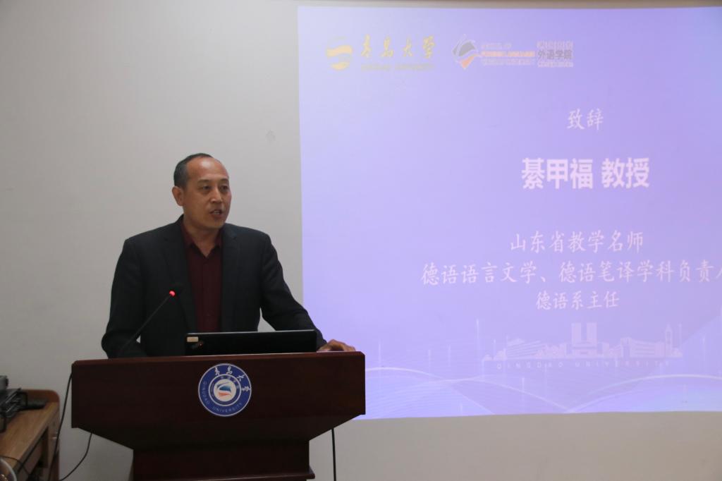 随后,山东省教学名师、德语系主任、德语语言文学和德语笔译学科负责人綦甲福教授作为学院导师代表发言。綦教授以“高、新、实”三个字简明扼要地表达了对学院研究生的期望。所谓“高”,是指要立足国家战略,锚定学术研究高度,以高标准服务国家软实力提升,以高要求对待学术研究和现实服务。“新”,意指拥抱学科交叉,激发创新动能,以技术赋能研究,打破学科壁垒。“实”,则是指立足实践需求,强化研究实效,对接社会需求的同时,也要深化产教融合。“高、新、实”,既是国家对研究生教育的殷切期望,也是学科发展与学生成长的必由之路。当前,国家正推进新文科建设,外语学科迎来前所未有的机遇。抬头看方向,低头做事情。綦教授希望同学们心怀“国之大者”,将个人研究融入民族复兴;永葆创新锐气,在交叉融合中开辟新领域;脚踩坚实大地,用学术成果服务社会所需。