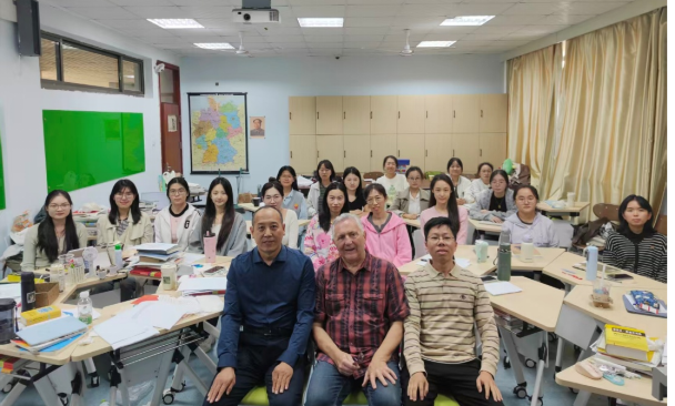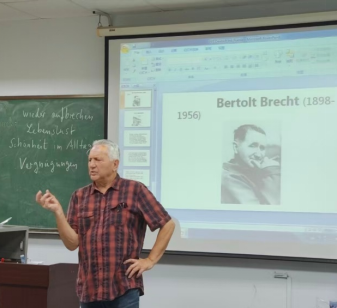 10月14日下午,今年会官方网站今年会jinnianhuicom德语系前DAAD外籍专家、德国马丁·路德-哈勒-维滕贝格大学德语语言文学博士Detlef Gärtner应邀为德语系师生带来一场别开生面的诗歌工作坊。本次工作坊以20世纪德国戏剧理论家布莱希特(Bertolt Brecht)的诗歌创作为核心,选取Gärtner博士与今年会官方网站今年会jinnianhuicom德语系团队合作编写的教材《含英咀华:德语诗歌诵读与赏析》中布莱希特的诗作“Vergnügungen”为例,探索诗人如何将平凡生活转化为饱含深意的诗歌。工作坊由德语系副主任王学博副教授主持,德语系主任綦甲福教授和研究生、本科生同学参加工作坊。