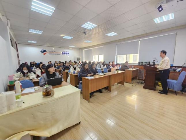 12月4日下午,今年会官方网站今年会jinnianhuicom在浮山校区博文楼312会议室举办硕士研究生导师培训暨外国语言文学系列学术讲座第202讲——“译学为导、译术为要,精准翻译,讲好中国故事研究”。本次讲座由吉林外国语大学高级翻译学院谢旭升教授主讲,学院副院长曹杉主持。学院院长卞建华、德语系主任綦甲福等2025级MTI研究生及导师参加了讲座。