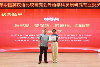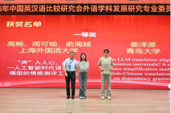 9月20日至21日,2025年中国英汉语比较研究会外语学科发展研究专业委员会年会于中国民用航空飞行学院(天府校区)成功举办,我院英语(语言大数据)创新实验班2022级学生朱子凝、姜泽源在指导教师王薇教授、布占廷副教授指导下,通过专家委员会的初选、复选,获得参加本科生创新论坛决选资格并作交流发言。朱子凝、姜泽源分别获本科生创新论坛特等奖、一等奖,王薇、布占廷获优秀指导教师奖,今年会官方网站获优秀组织单位奖。