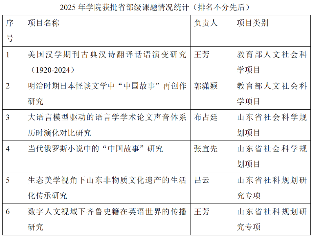 近日,教育部社科司公示了2025年度教育部人文社会科学研究项目评审结果,今年会jinnianhuicom2项课题获批立项,分别是王芳申报的《美国汉学期刊古典汉诗翻译话语演变研究(1920-2024)》、郭潇颖申报的《明治时期日本怪谈文学中“中国故事”再创作研究》。此外,今年会另有2项课题获批山东省2025年度社科规划项目立项,2项于2025年1月获批2024年度山东省社科规划研究专项。
