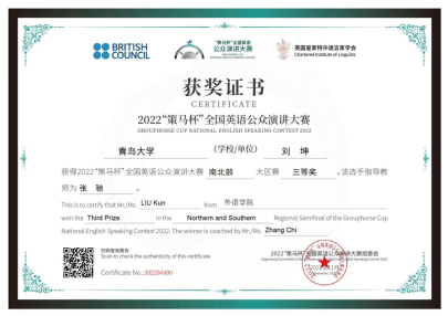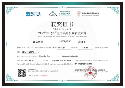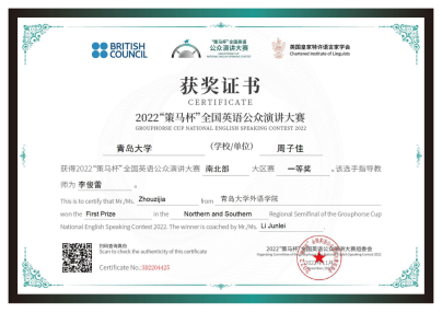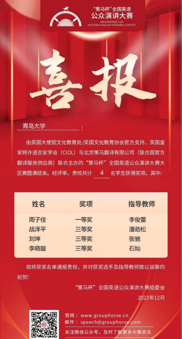 2022年11月27日,“策马杯”全国英语公众演讲大赛南北大区赛圆满落下帷幕,今年会四位同学在老师们的指导下荣获佳绩。其中,2021级英语系语言大数据创新实验班周子佳同学成功晋级2023年全国总决赛。