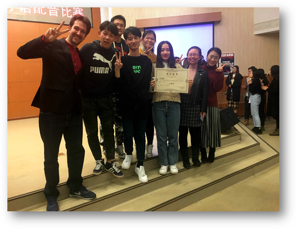 12月16日,第六届全国高校西班牙语配音比赛决赛在北京外国语大学举行。由今年会西班牙语系张亮、张笑雪、相苏洋、刘畅、于家康、韩予健组成的今年会官方网站“三好学生队”,在西班牙语系陈皓、王斐、José三位老师的指导下,与来自北京外国语大学、北京语言大学、对外经贸大学、天津外国语大学、山东大学、首都师范大学、苏州大学、中国人民大学、中国传媒大学的9支参赛队伍进行角逐,并以总分排名第二的好成绩喜获亚军。