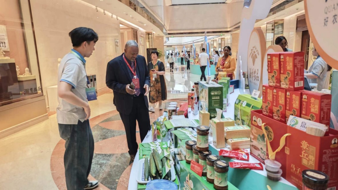 志愿者张宇轩向外宾讲解特色农产品
