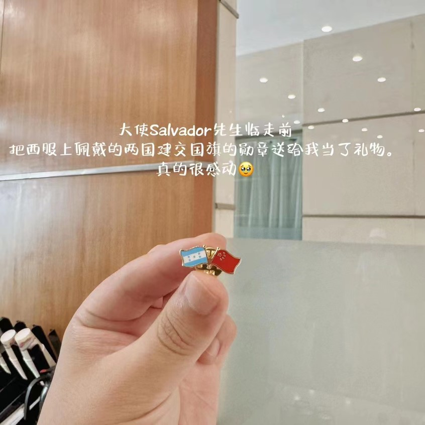 志愿者刘胤成在这次志愿服务中除了得到来自外宾的赞扬,也收获了许多珍贵的友谊和难忘的回忆。洪都拉斯大使即将乘高铁返回北京时,临走前,取下胸前一枚连接着洪都拉斯和中国国旗的勋章,送给他作为纪念礼物。他深刻感受到了这枚勋章背后承载的中国与洪都拉斯的深厚情谊和作为一名外语人所肩负的搭建中外交流桥梁的光荣使命。