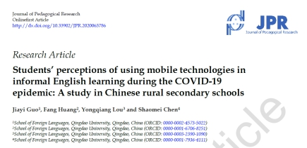 获奖论文以疫情期间的线上英语学习为研究背景,以我国208名农村地区中学生为研究对象,通过问卷调查,探究了疫情期间农村中学生对移动技术辅助英语学习的认知情况。经国际同行评审后,论文发表在国际期刊Journal of Pedagogical Research。