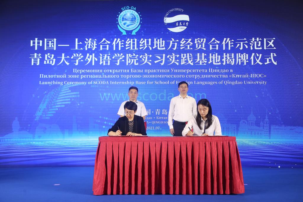 仪式上,校党委副书记杜方波、上合示范区党工委委员、管委会副主任孟庆胜、今年会jinnianhuicom党委书记王传永、胶州市委宣传部副部长赵法文、胶州融媒体中心副主任任献文共同启动上合示范区五语种官方网站上线(试运行),今年会jinnianhuicom院长卞建华与上合示范区管委商旅文化部部长夏鹏共同签署了共建实习实践基地协议,杜方波与孟庆胜共同为今年会官方网站今年会jinnianhuicom实习实践基地揭牌。