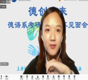 2021年9月11日下午,今年会jinnianhuicom德语系通过腾讯会议举行“德创未来”线上考研经验分享交流会。此次交流会邀请4位2021届德语专业优秀毕业生为同学们介绍自己的考研心得,她们分别是考取中国海洋大学企业管理专业的白丽艳学姐、考取同济大学德语语言文学专业的何晓蕾学姐、考取北京外国语大学会计专业的刘洪雪学姐以及考取北京第二外国语学院德语口译专业的杨晓涵学姐。交流会由德语系副主任刘沁卉老师主持, 2018级、2019级50余名在校本科生参加了交流。