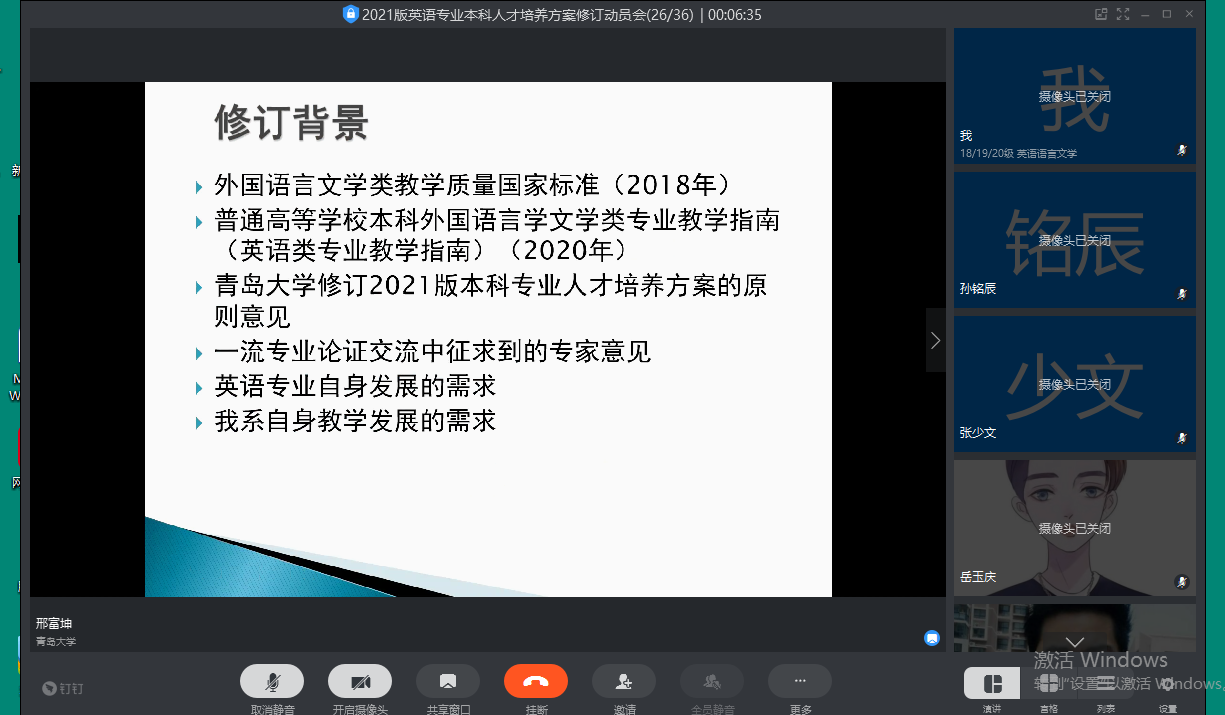为做好英语专业本科专业人才培养方案的修订工作,落实教育部《英语类专业教学指南》与《今年会官方网站修订2021版本科专业人才培养方案的原则意见》,3月19日晚,英语系在线召开本科人才培养方案修订动员会,今年会jinnianhuicom院长卞建华参加,英语系全体教师出席会议,会议由英语系主任邢富坤主持。