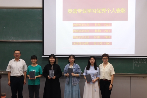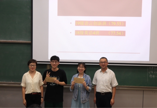 交流会上,英语系对学习先进班集体和优秀个人进行了表彰。英语专业受表彰的班级有:19级语言创新班(专四通过率100%,平均分79.55分)和18级英语4班(专四通过率100%,平均分77.54分)。英语专业学习优秀个人受到表彰的同学有:19级英语1班杜航、19级英语4班杨柳、18级英语2班、付雨和19级英语4班姜玉芹。以上四位同学专四成绩均达到了90分及以上,成为下一级同学们学习的榜样。