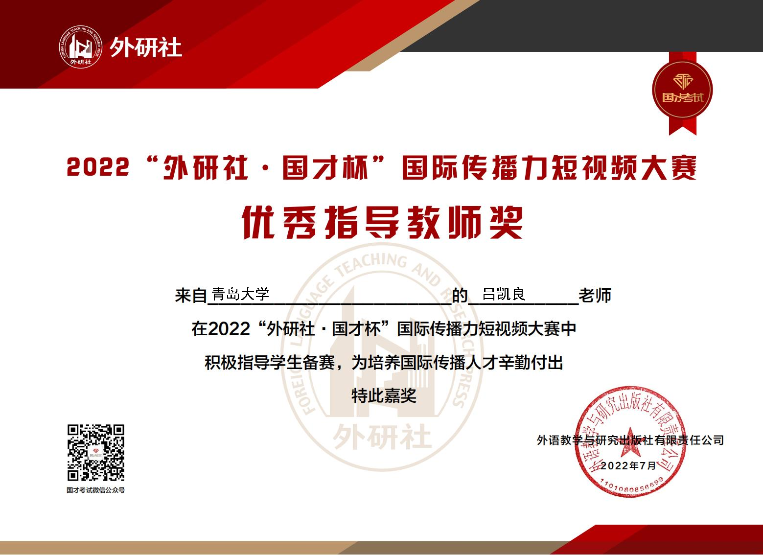 7月1日,2022“外研社·国才杯”国际传播力短视频大赛复赛结果公布。今年会jinnianhuicom英语教育系20级学生刘晓艺通过初赛和复赛,过五关斩六将,最终取得全国二等奖的好成绩。吕凯良老师获优秀指导教师奖。