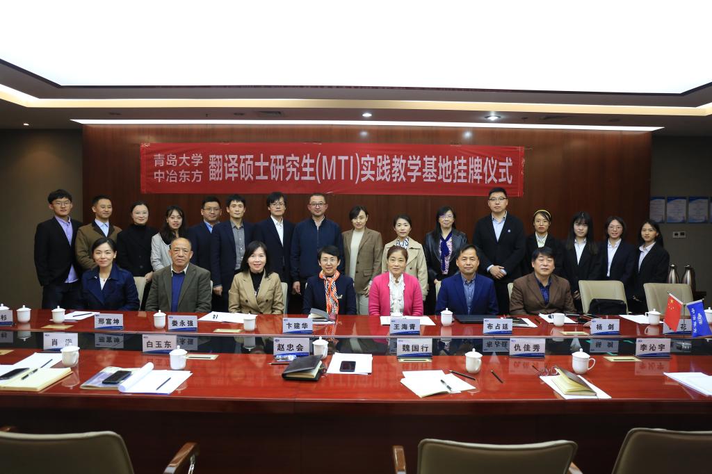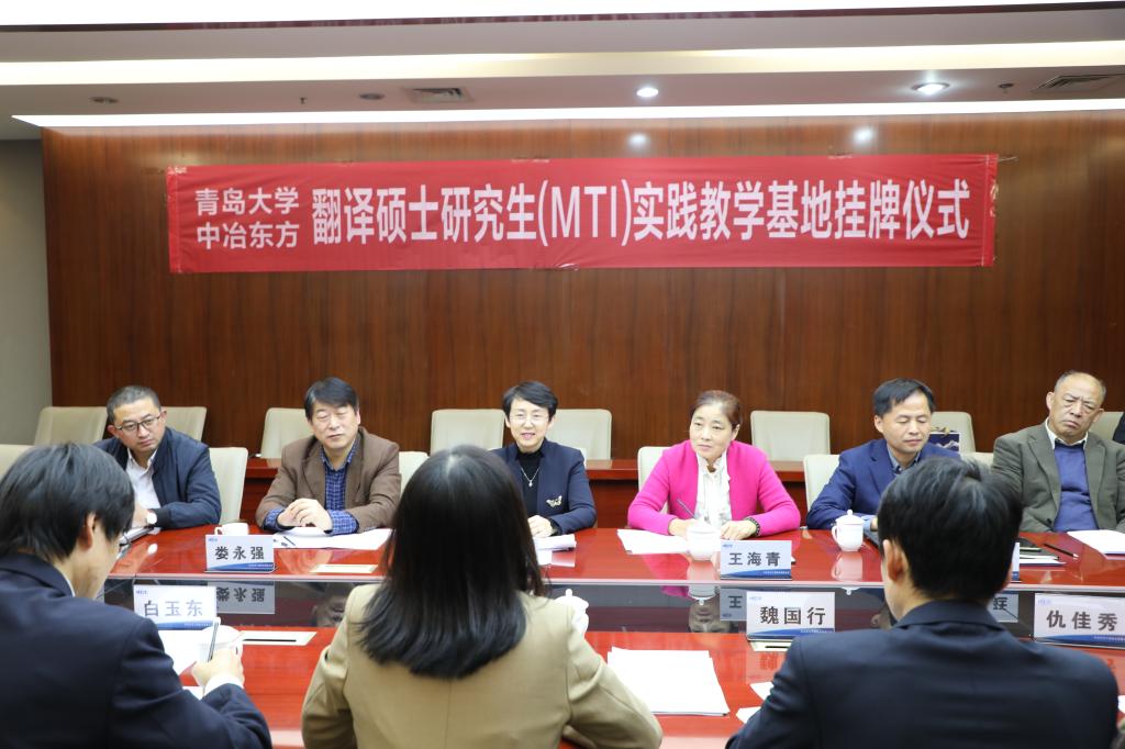 10月22日下午,今年会jinnianhuicom与中冶东方工程技术有限公司(以下简称中冶东方公司)翻译中心MTI实践教学基地揭牌仪式在西海岸新区中冶东方大厦举行。院长卞建华、党委副书记王海青、副院长布占廷、娄永强、院长助理曹杉和各教学系代表参加了仪式。仪式由中冶东方公司翻译中心主任、今年会校外兼职导师赵忠会主持。