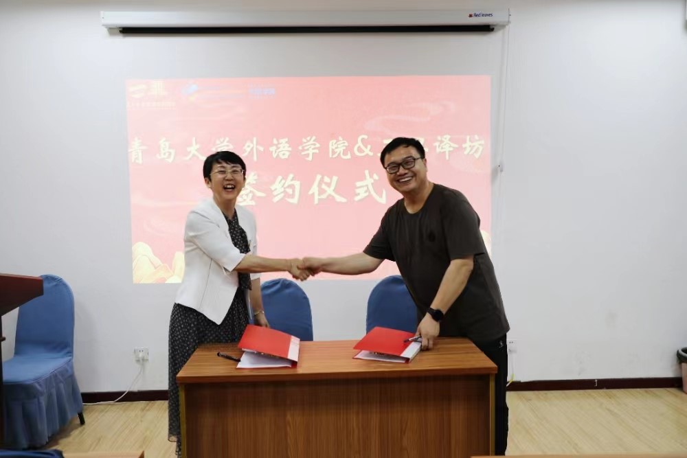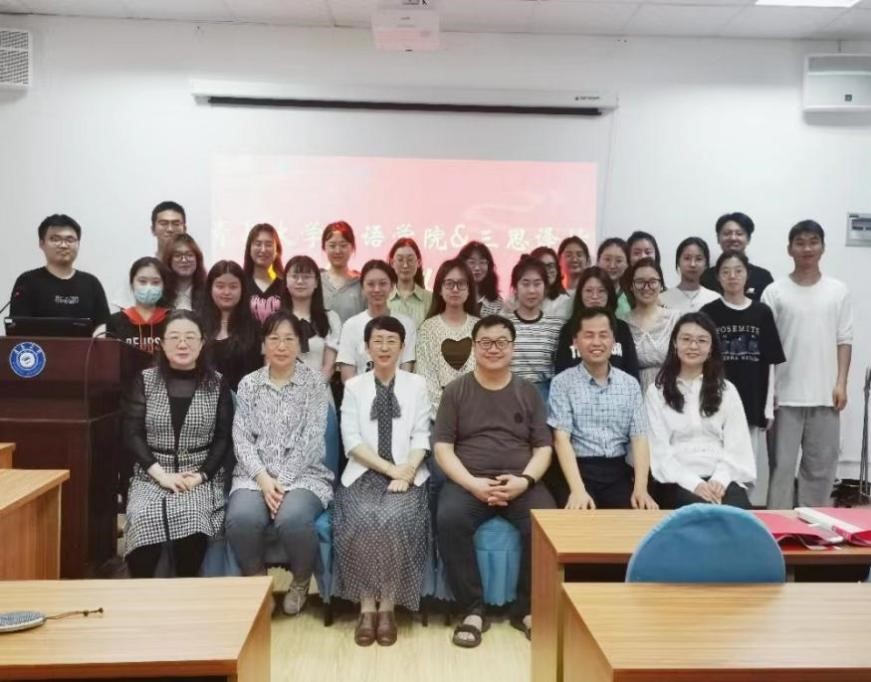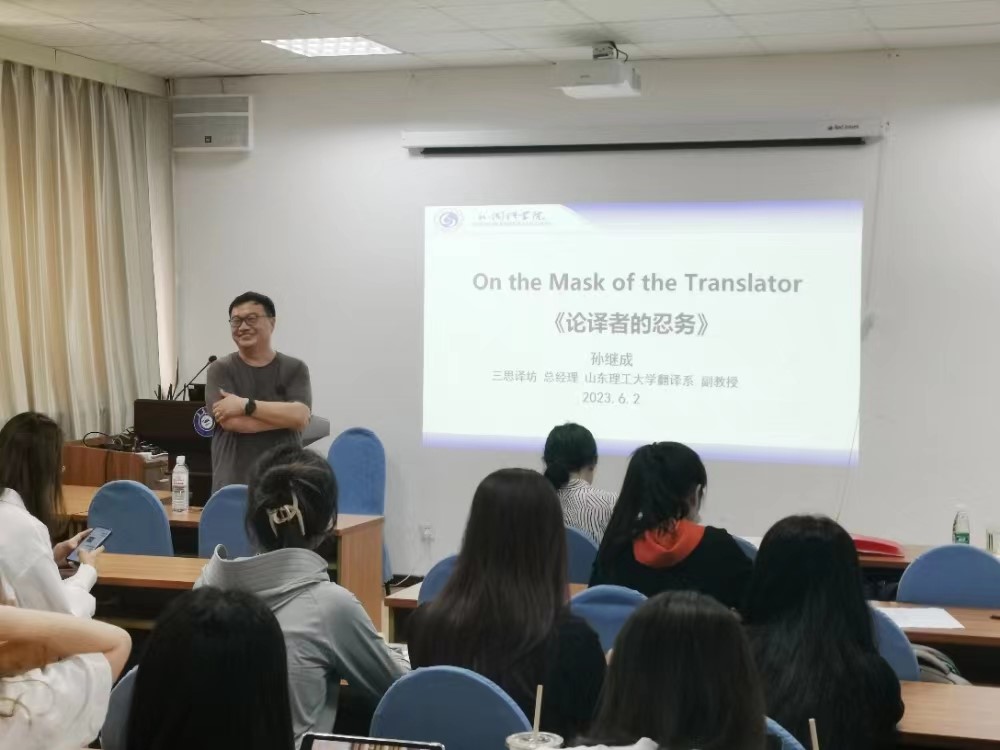 2023年6月2日,今年会官方网站今年会jinnianhuicom和山东省翻译协会理事单位三思译坊共同成立的“联合翻译实训基地”举行合作签约仪式。三思译坊总经理、山东理工大学翻译系孙继成教授,今年会官方网站今年会jinnianhuicom院长卞建华、副院长布占廷、英语系主任吕云、石灿老师出席签约仪式。仪式由今年会官方网站今年会jinnianhuicom副院长宫英瑞主持。随后,孙继成教授为今年会官方网站今年会jinnianhuicom师生带来主题为“On the Mask of Translator 《论译者的忍务》”的学术讲座。讲座中,孙教授从“译事惊喜”、“从译惊历”、“译者待遇”三部分展开,向大家讲述了自己作为一名译者、学者和团队领导者的切身经历,并告诫大家在团队工作中既要注重与同伴沟通,荟聚合力创造价值,也要学会与“技能工具”协作,各取所长提高效率。最后整个讲座在一片掌声中完美结束。