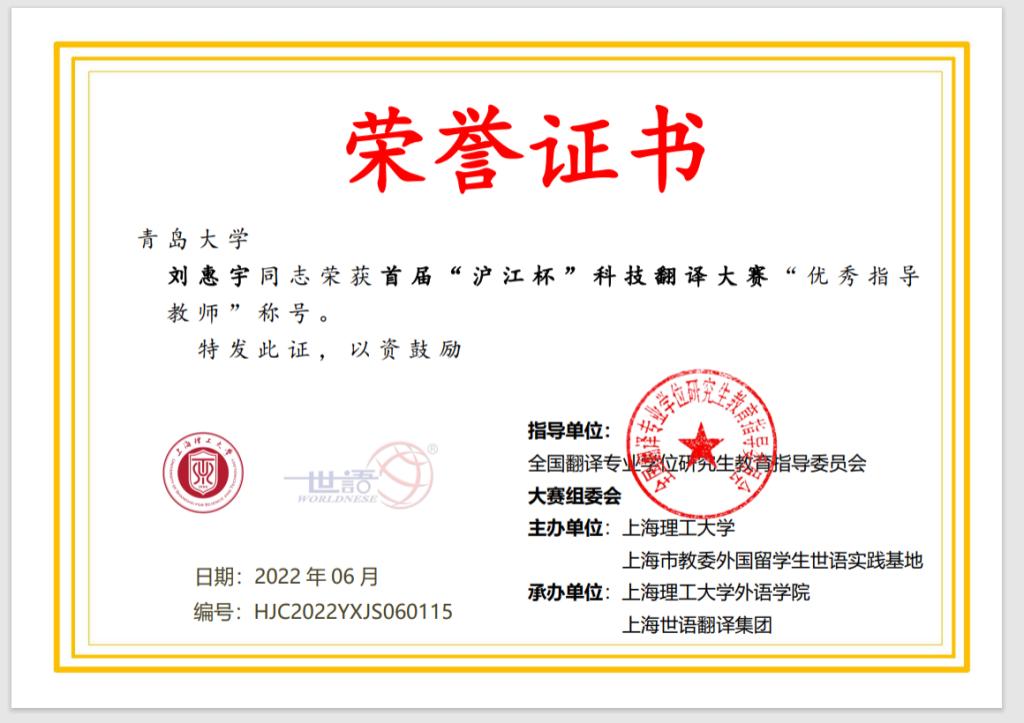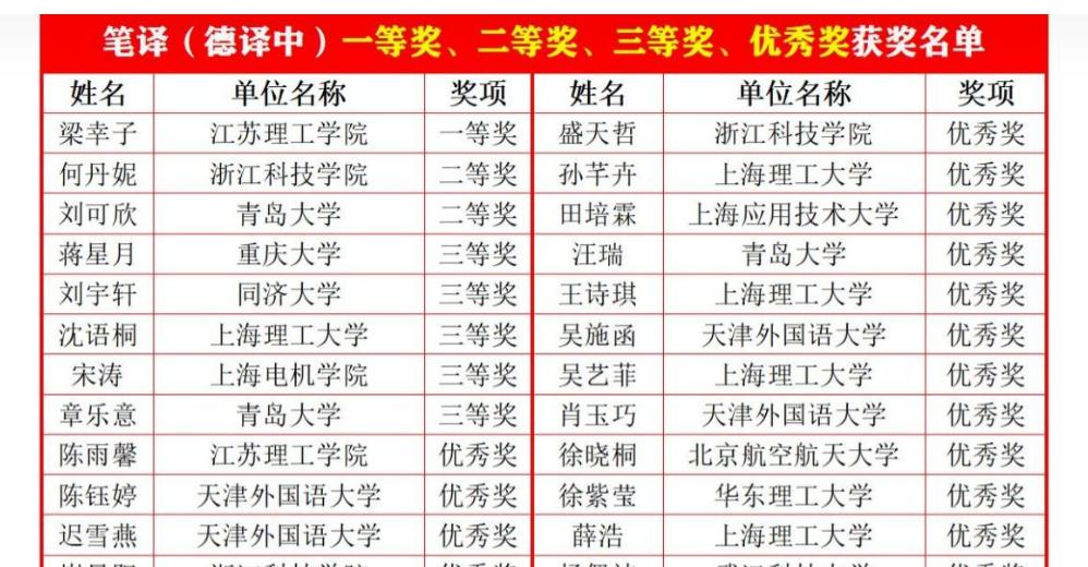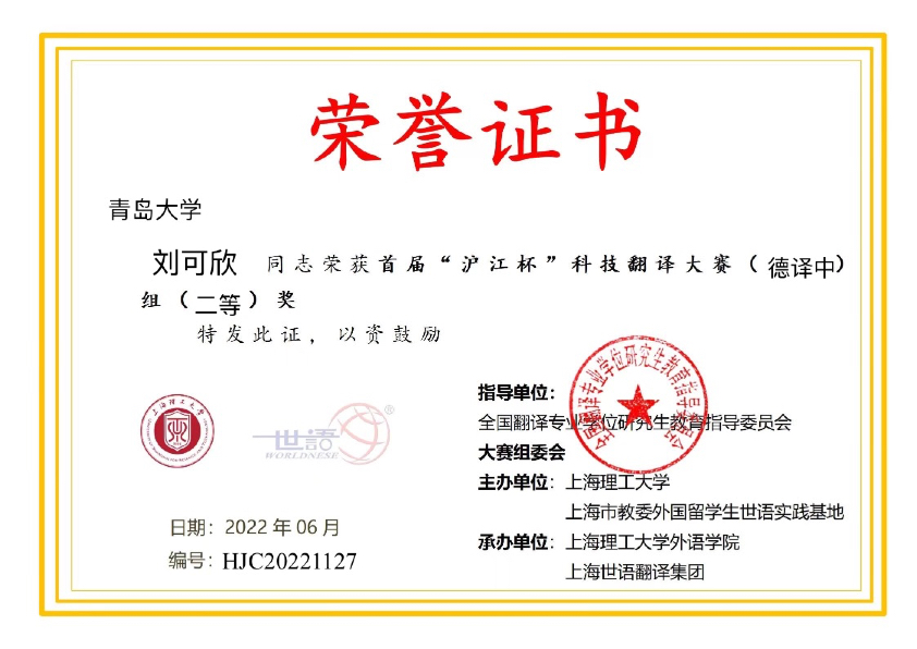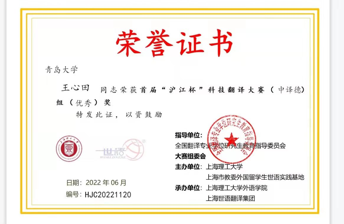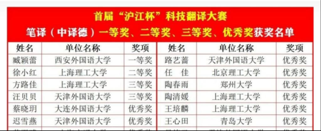 首届“沪江杯”科技翻译大赛近日公布获奖名单,今年会官方网站今年会jinnianhuicom德语系4名同学获奖,其中2021级德语笔译专业研究生刘可欣同学(指导教师:刘惠宇)喜获德译中全国第三名(二等奖)、章乐意同学(指导教师:王学博)获得三等奖、汪瑞同学(指导教师:綦甲福)获得优秀奖;2019级德语本科省王心田同学(指导教师:王学博)获得中译德优秀奖。另外,现在在天津外国语大学读研的我系16级本科生迟雪燕同学获得德译中和中译德优秀奖。德语系教师刘惠宇和王学博获得优秀指导教师奖。