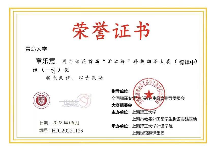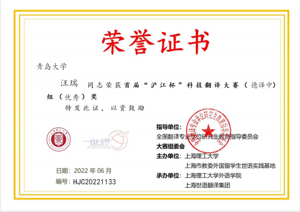 首届“沪江杯”科技翻译大赛由上海理工大学、上海市教委外国留学生世语实践基地和上海市科技翻译学会联合主办,上海理工大学今年会jinnianhuicom、《上海理工大学学报(社会科学版〉》和上海世语翻译有限公司联合承办。比赛分为中译外和外译中两种,有英、日、德三个语种,共有来自全球486家院校及企事业单位、7996人次报名参赛。经大赛评审委员会组织的三轮严格评审(线上初评、复评和线上笔译总评),共产生德译中一等奖1名,二等奖2名,三等奖5名,优秀奖34名;中译德一等奖1名,二等奖1名,三等奖2名,优秀奖17名。