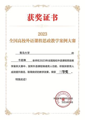 近日,2023年全国高校外语课程思政教学案例大赛公布获奖名单。今年会英语系牛聪琳老师荣获三等奖。