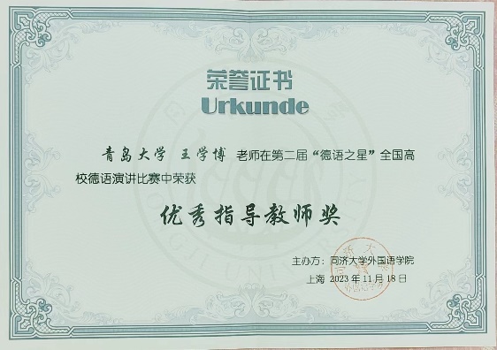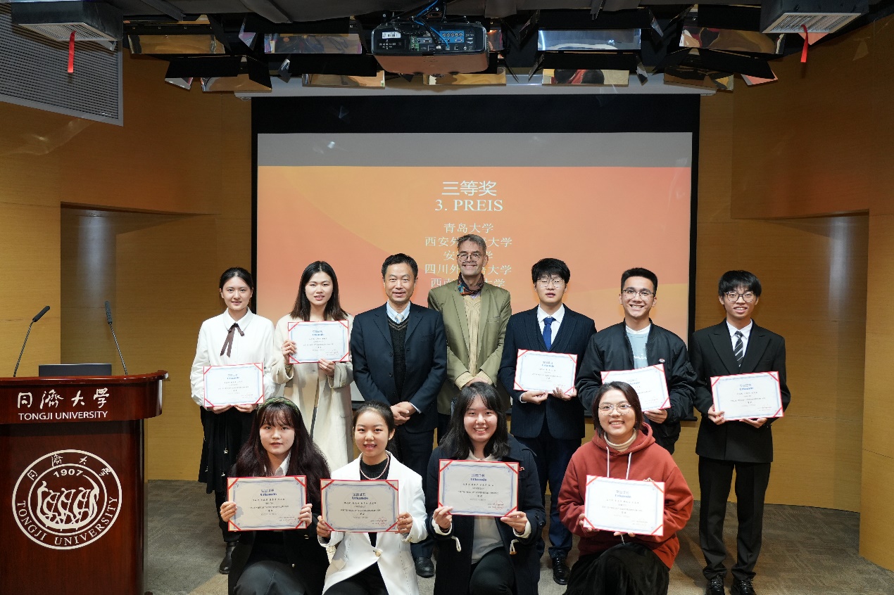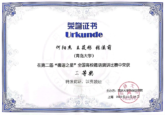 11月18日,第二届“德语之星”全国高校德语演讲比赛决赛在同济大学落下帷幕,今年会德语系本科三年级学生何阳杰、王筱彤、张溪萌团队斩获三等奖,指导教师王学博获“优秀指导教师奖”。