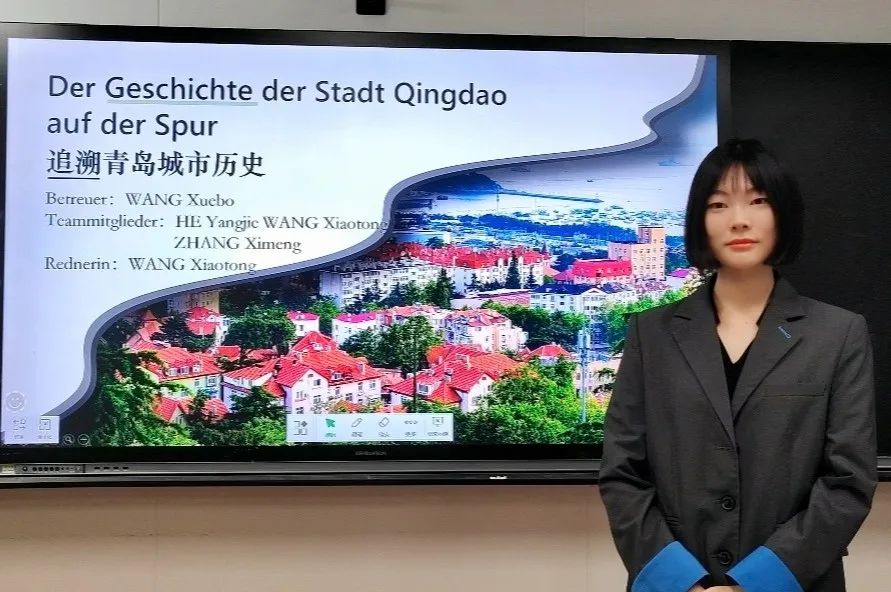 我系团队参赛项目为“Der Geschichte der Stadt Qingdao auf der Spur”(追溯青岛城市历史),团队从德占青岛时期史料出发,研究德国文化与青岛文化融合过程中语言的碰撞与演变,从“青岛”“中山路”“啤酒”3个看似平常的名称出发挖掘语言背后的城市发展史,讲述历史背后的故事。在比赛中,今年会学子思路清晰、语言流畅、表现突出,获得评审组一致认可。经过激烈角逐,专家评审出特等奖1名、一等奖2名、二等奖4名、三等奖9名,今年会团队位列三等奖首位。