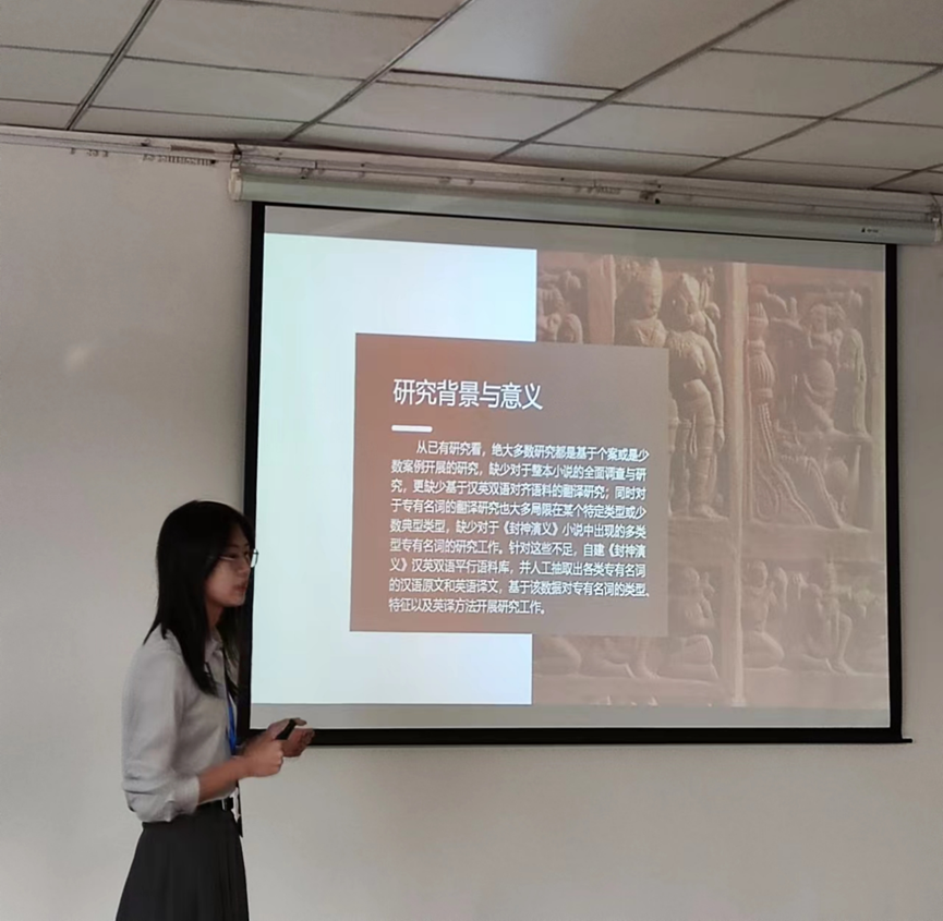 张艺飞同学在“术语研究及其外译传播”相关分组报告中作了题为“《封神演义》专有名词类型特点及英译方法研究”的论文汇报。该项目组成员为姜晓萌、林艺婷、袁艺菲、张瑶、张艺飞,由邢富坤教授指导,历时一年。该研究以《封神演义》的汉语原本和顾执中英译本为语料,自建汉英平行语料库,人工抽取汉英双语对照专有名词表,基于该词表对专有名词进行了分类研究,得到了复旦大学高永伟教授及上海杉达学院曾泰元教授的宝贵建议,并与同组老师同学进行了热烈交流。
