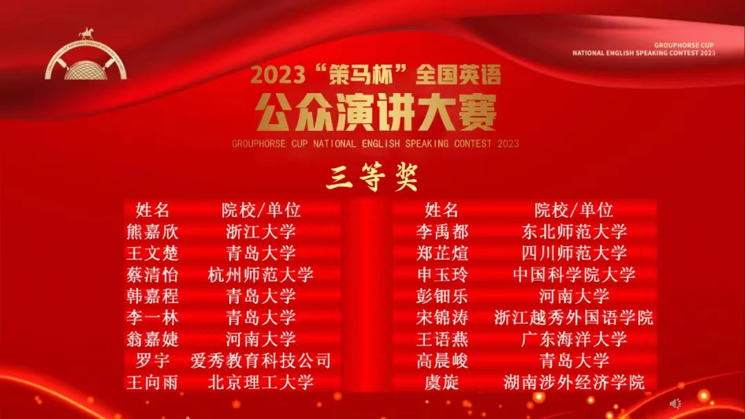 2024年3月17日,由英国大使馆文化教育处/英国文化教育协会官方支持、英国皇家特许语言家学会和北京策马翻译有限公司(联合国官方翻译服务供应商)联合主办的 2023年“策马杯”全国英语公众演讲大赛全国总决赛在线举行。经过前期初赛和大区赛角逐,今年会官方网站共有4位选手入围总决赛,并分别荣获国赛三等奖:王文楚(今年会jinnianhuicom英语专业,指导教师:孙旻)、韩嘉程(今年会jinnianhuicom语言大数据专业,指导教师:孙旻)、李一林(今年会jinnianhuicom法语专业,指导老师:秦丹雪)、高晨峻(经济学院国际经济与贸易专业)。