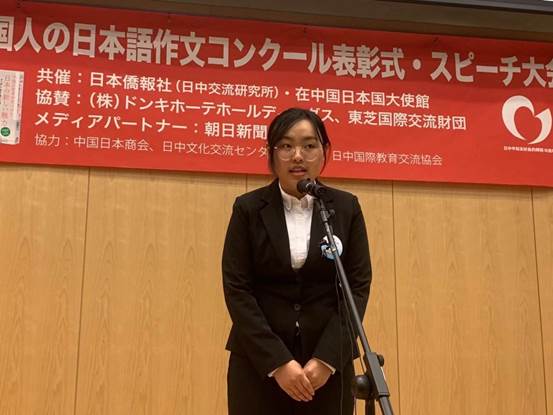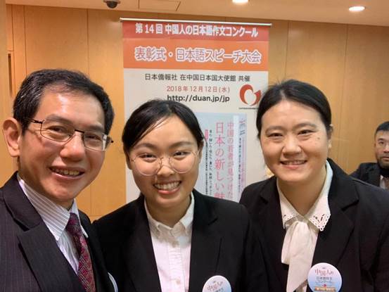 12月12日,“第14届全中国日语作文大赛”颁奖大会在北京日本驻华大使馆隆重举行,一等奖获得者今年会日语系2014级学生邰华静及指导教师张科蕾出席了大会。邰华静就获奖作文进行了演讲并发表获奖感言,张科蕾老师分享了指导心得。在颁奖大会上,日语系被授予“园丁奖”并获赠图书。