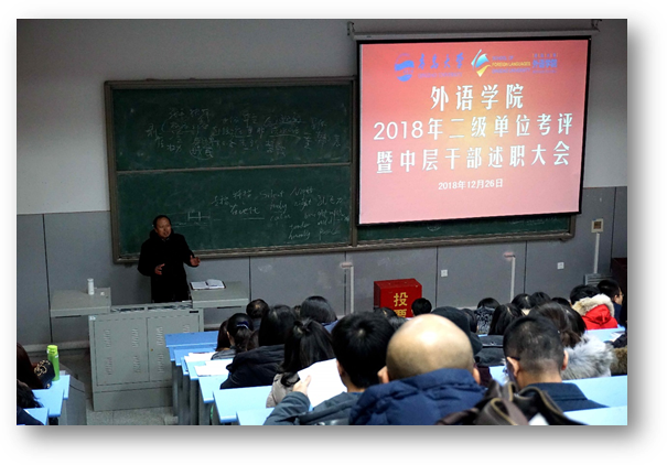 12月26日下午,学院在博文楼217阶梯教室召开2018年二级单位考评暨中层干部述职大会,对2018年度学院和班子成员工作开展情况进行公开考评。院党委书记吴绍新主持。学院党政班子、全院教职工参加大会。学校党委组织部副部长、党校常务副校长、校部第一党总支书记李晓池全程监督考评会议。