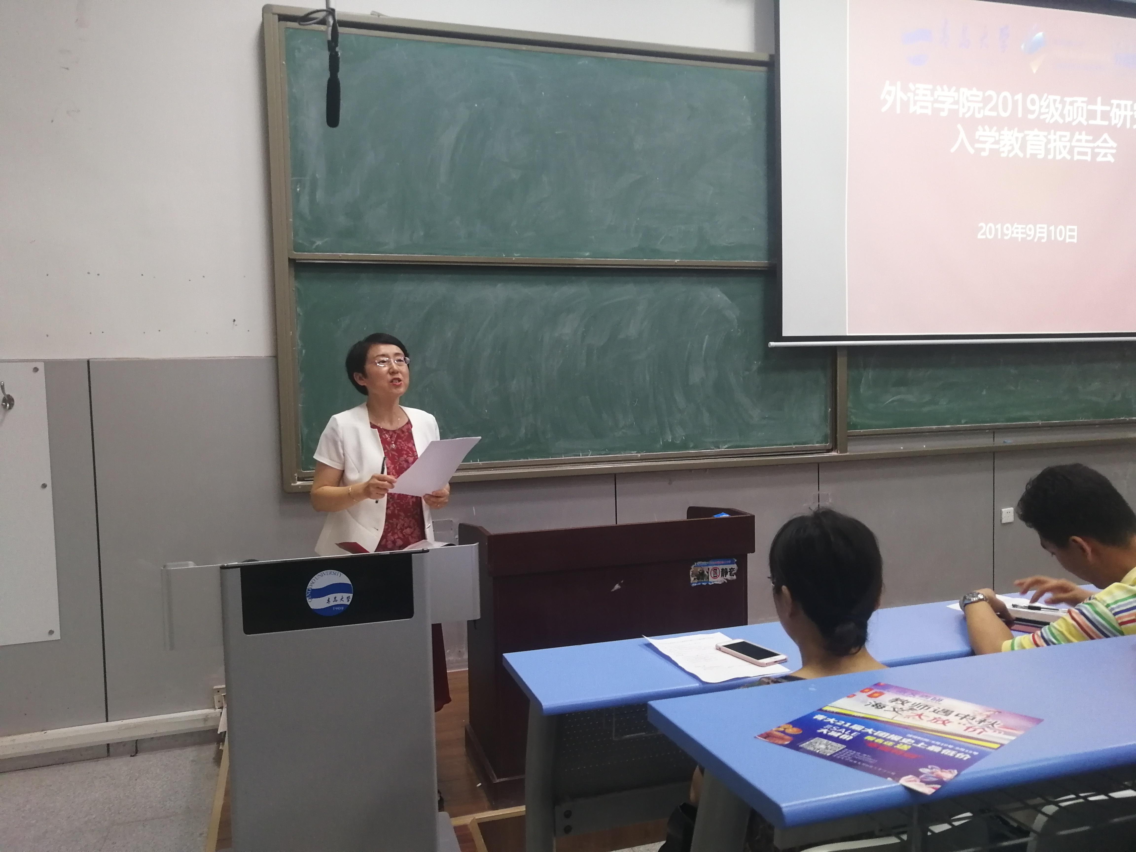 首先,卞建华院长向2019级硕士研究生表示了祝贺,她勉励同学们要不勿忘初心,砥砺前行,规划好自己的研究生生活;要保持信心,不断发掘潜力,以应对外语学科面临的挑战;不仅要学习语言技能本身,更要培养跨文化交际能力;要积极参与学术实践活动,与老师和同学们共同进步。最后,卞院长告诫大家,求学之路上,一定要有锲而不舍的精神,只要坚持梦想,人生之路一定会越走越宽。