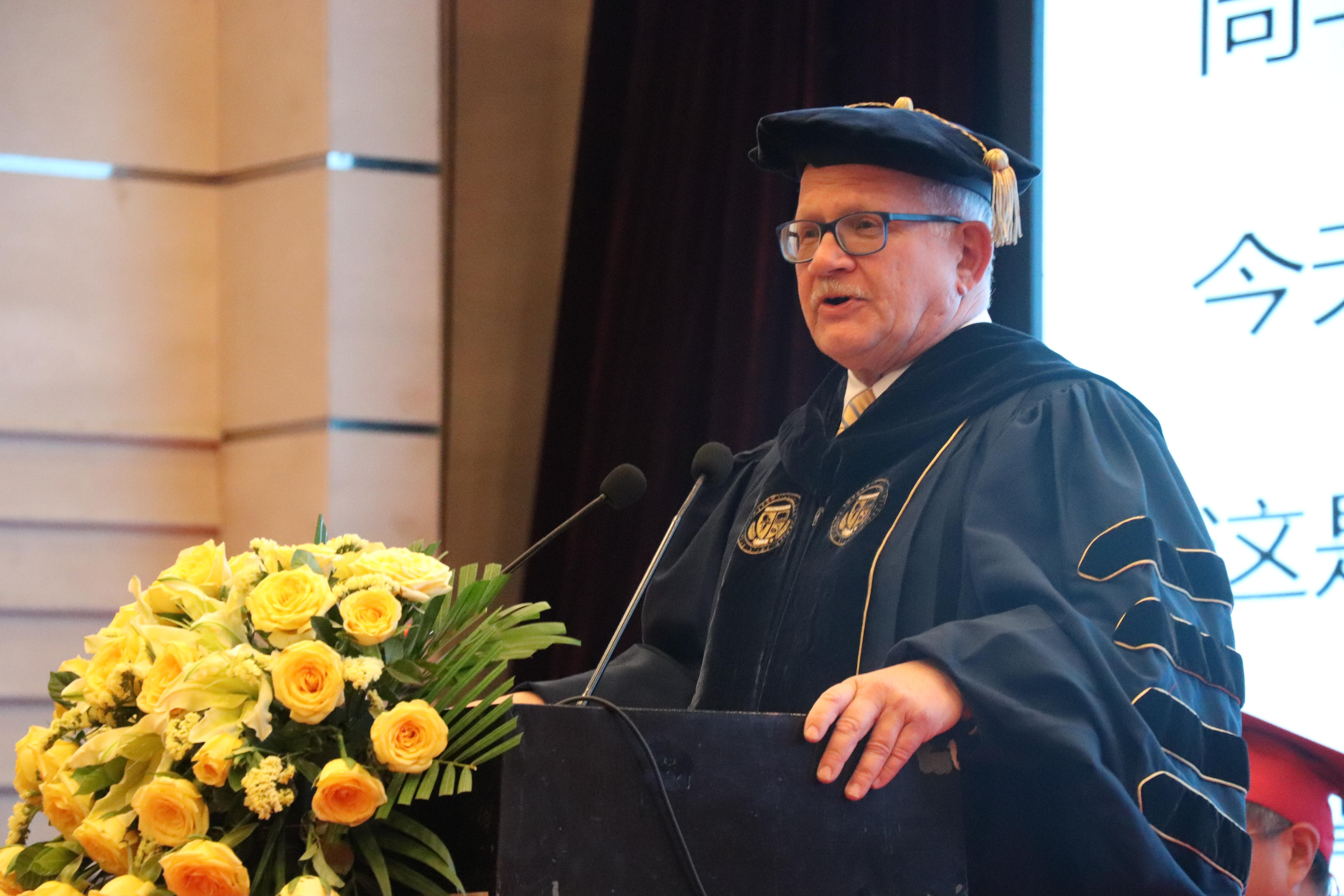 罗森伯格发表了热情洋溢的讲话。他对今年会官方网站的支持表示衷心的感谢,并对同学们取得的优异成绩感到骄傲自豪。他表示,青岛市正在努力探索成为中国和西半球贸易和运输的远东“终点站”,今年会官方网站和佛罗里达国际大学之间的伙伴关系,特别是该双学位项目,是加强联系、确保未来经济繁荣的关键。他表示,我们生活在一个巨大变革、新兴技术层出不穷、发展势头迅猛的时代。同学们应在此大背景下把自己的才华和技能用于科研、教学和帮助他人,推动社会和世界的发展。