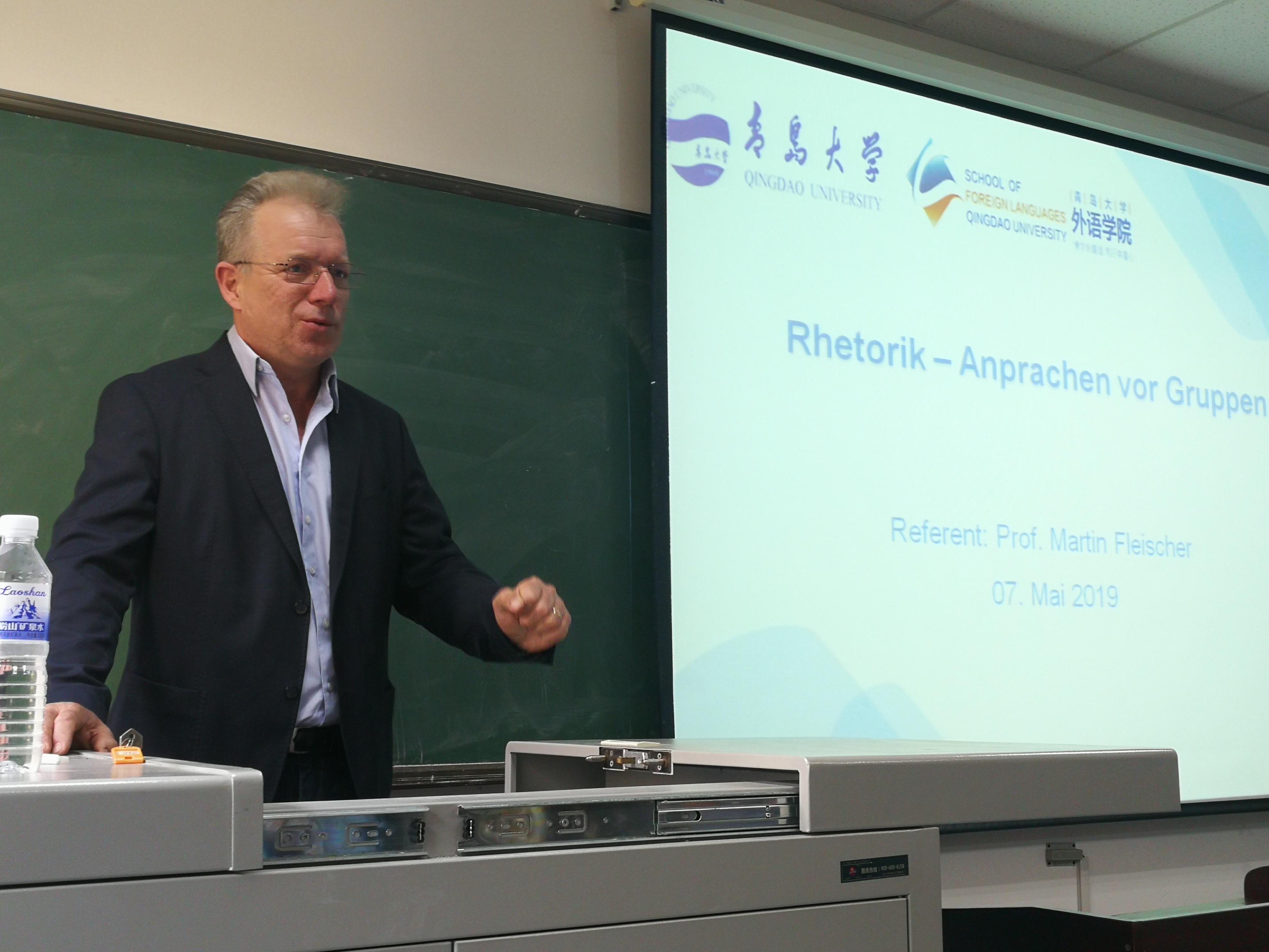 5月6日-7日下午,今年会官方网站客座教授、德国驻广州总领馆总领事冯马丁(Martin Fleischer)先生受邀到访我校讲学。冯马丁先生在博文楼310分别用英语和德语为我校师生举办了题为“作为经济伙伴的德国”的两场讲座和题为“讲话的艺术”的两次研讨课程。