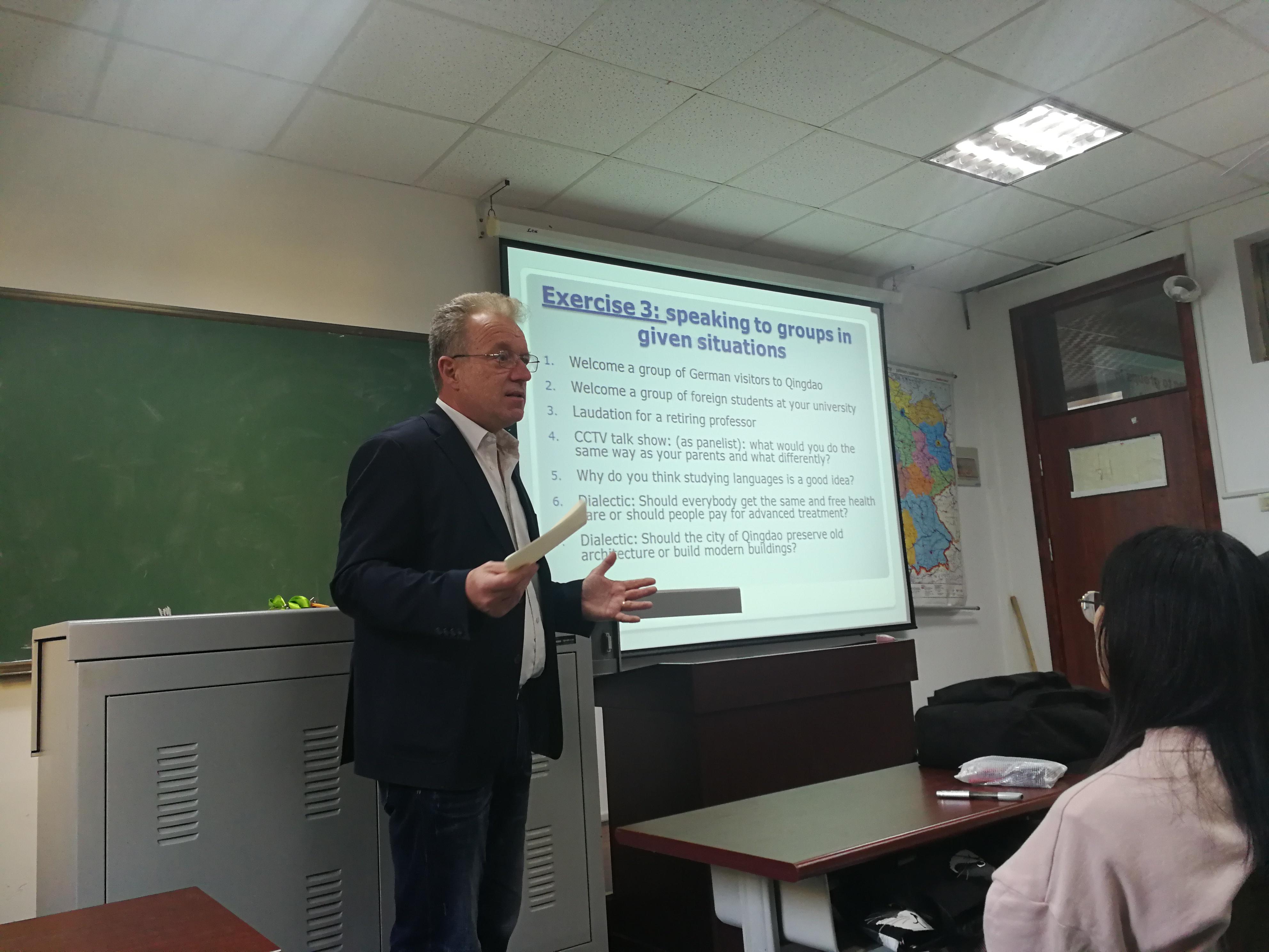 在“讲话的艺术”专题研讨课上,冯马丁教授结合大量的实践练习,向师生们系统地介绍了语言交流、非语言交流的基本原理和公共演讲的内容与结构,结合自己的经验,讲解了在不同情况下准备和进行公共演讲的方法、技巧和注意事项。在此基础之上分小组练习。各小组挑选题目,讨论准备简短的演讲,最后每组派出两名代表分别介绍小组练习情况和发表演讲,冯马丁教授带领同学们对各组的展示和演讲做了点评。讨论过程中,同学们积极发言,即学即用,演讲水平得到显著提高。