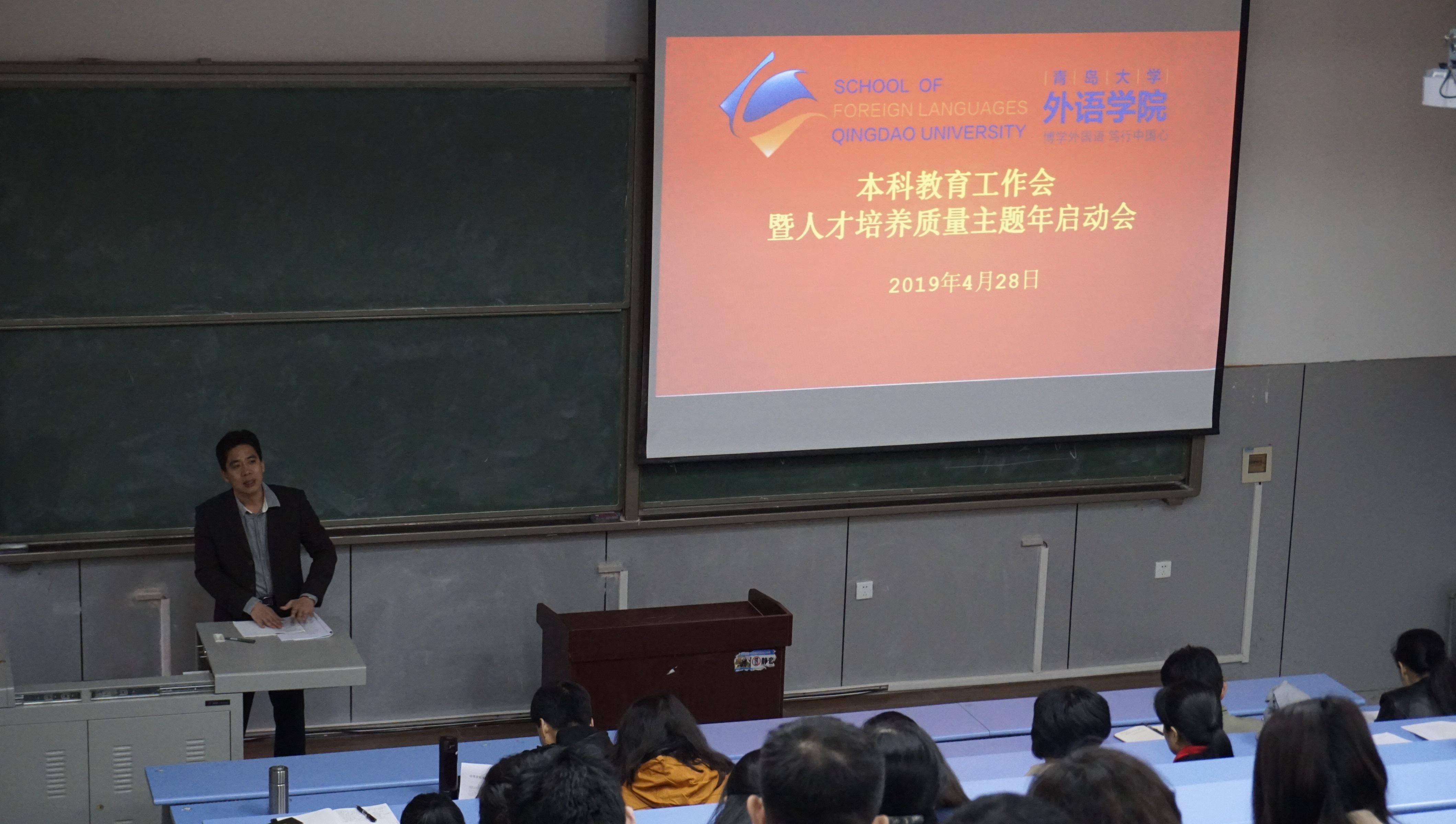在报告中,孔伟金首先从新时代高等教育改革与发展的背景讲起,解读了2018年全国教育工作会、新时代全国高等学校本科教育工作会、山东省教育大会、校第三次党代会等会议精神。然后,以“人才培养基础工程干什么、怎么干”为主线,重点围绕学校在“专业认证、课程建设、创新创业、人才培养国际化、专业建设、教师教学能力提升、教学评价体系与机制、本科招生与就业、教学质量提升”等十个方面的思路与举措进行了系统阐述。最后,孔伟金结合今年会jinnianhuicom在发展定位、人才培养定位、学院继续深造率和学生竞赛、人才培养标志性成果培育、激发学生学习兴趣和潜能等方面存在的问题,提出了可行性建议。他希望外院全体教职工切实把本科教育工作摆在重要位置,以提升人才培养质量为目标,系统谋划好教学、科研、学科建设的融合发展工作,力争探索打造提升本科教育质量的外院模式。