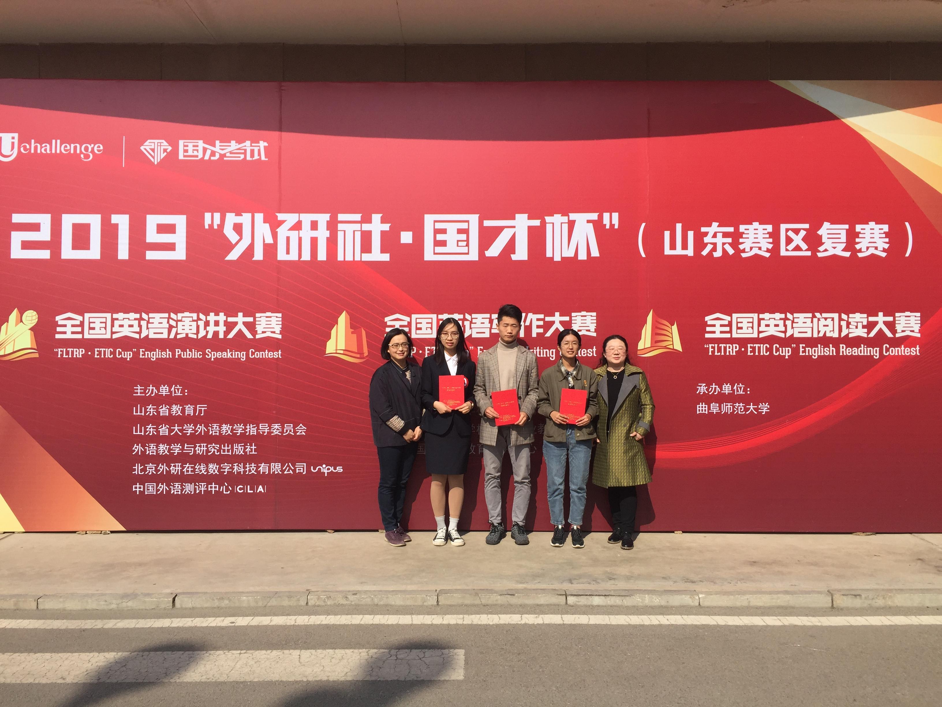 10月27日,2019年“外研社·国才杯”全国英语大赛山东赛区复赛在曲阜师范大学落下帷幕。今年会2017级李奇英、韩通、张露茜三名同学代表我校专业组分别参加了写作、阅读、演讲大赛。经过两天的角逐,李奇英获得写作大赛一等奖,韩通获得阅读大赛一等奖,张露茜获得演讲大赛二等奖。吕云、徐平、潘劲松三位老师获得优秀指导教师称号。来自全省16地市、近70所高校的400余名选手参加了本次大赛。
