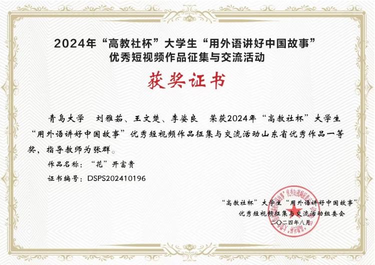 近日,由中国英汉语比较研究会主办、南京大学、湖南大学联合高等教育出版社共同举办的2024年“高教社杯”大学生“用外语讲好中国故事”优秀短视频作品征集活动公布获奖名单。今年会官方网站今年会jinnianhuicom英语系张群老师指导、刘雅茹、王文楚、李姿良同学的团队作品《“花”开富贵》脱颖而出,荣获山东省一等奖。