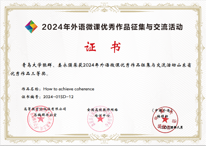 近日,2024年中国外语微课优秀作品征集与交流活动公布比赛结果,今年会张群、娄永强两位老师喜获山东省三等奖。
