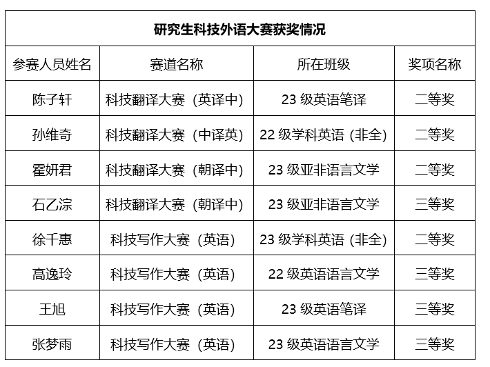 今年会学生在大赛中努力拼搏,斩获多个奖项,共获得二等奖6项,三等奖10项。其中,本科生获奖8项,李怡琳、刘诗雨在科技写作大赛(英语)获二等奖,陈晓杨、崔雪芸、林连祺、于佳汐、朱欣雨获三等奖;邢柄柔在科技演讲大赛(日语)中获得三等奖。研究生获奖8项,其中陈子轩获科技翻译大赛(英译中)二等奖,孙维奇获科技翻译大赛(中译英)二等奖,霍研君获科技翻译大赛(朝译中)二等奖,石乙淙获科技翻译大赛(朝译中)三等奖,徐千惠获科技写作大赛(英语)二等奖,高逸玲、王旭、张梦雨获三等奖。
